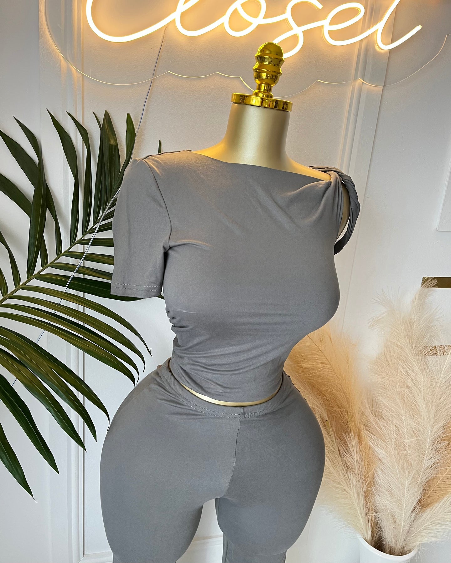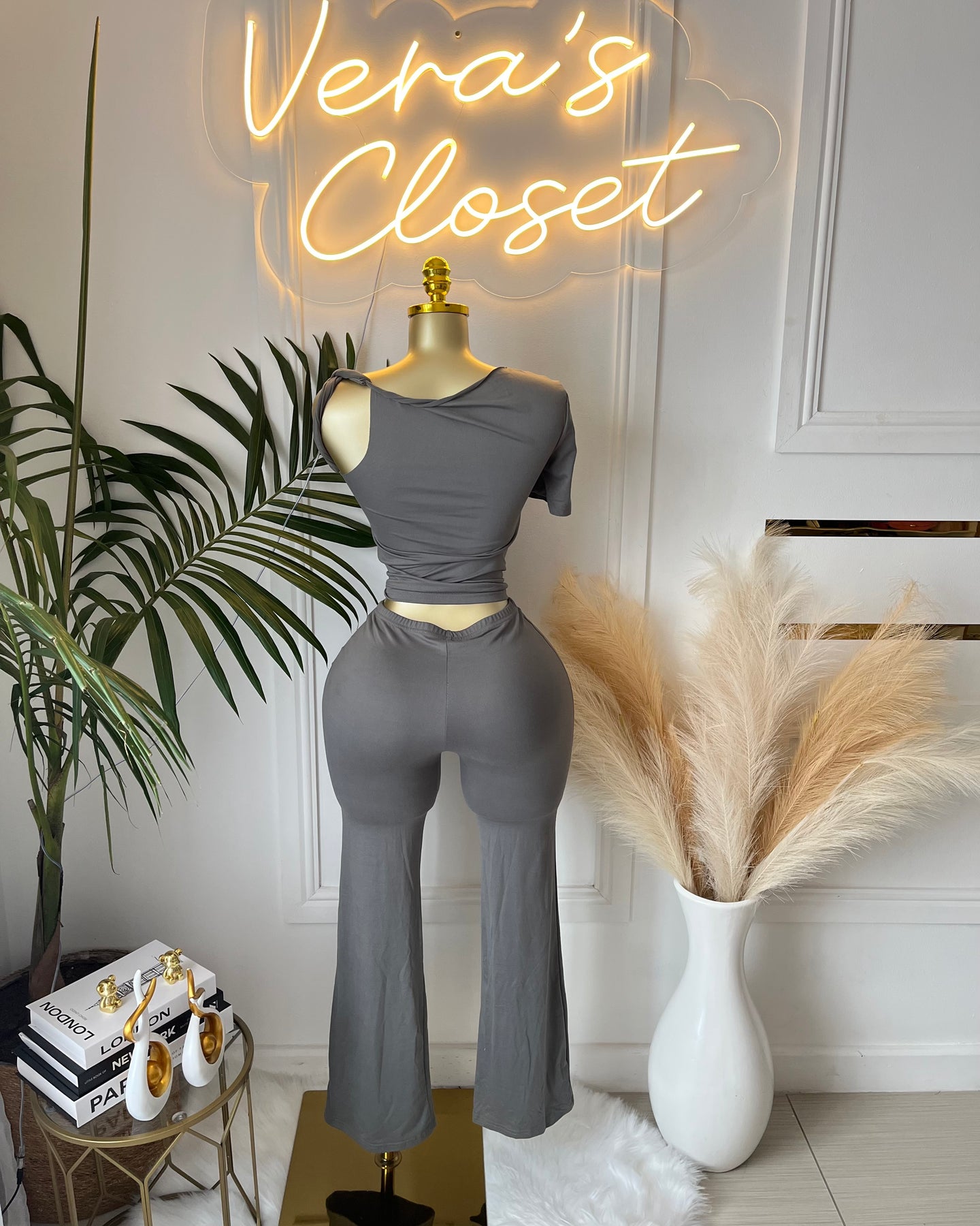 Step into sleek confidence with the Sienna Grey Two-Piece Set. Featuring a ruched side-knot crop top and flared pants that sculpt your silhouette. 🔥