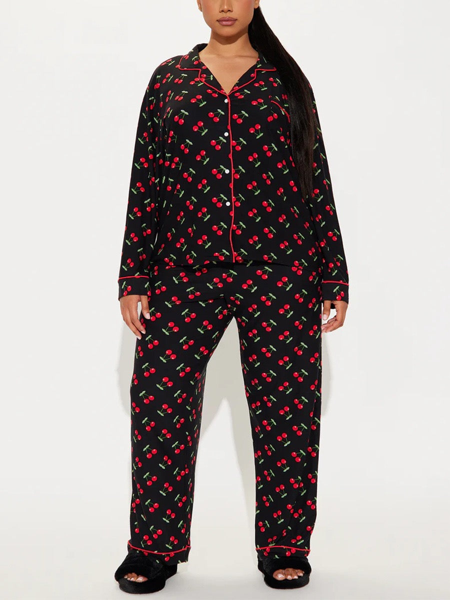 - Clothing Feature: Cherry print, contrast piping, classic pajama style