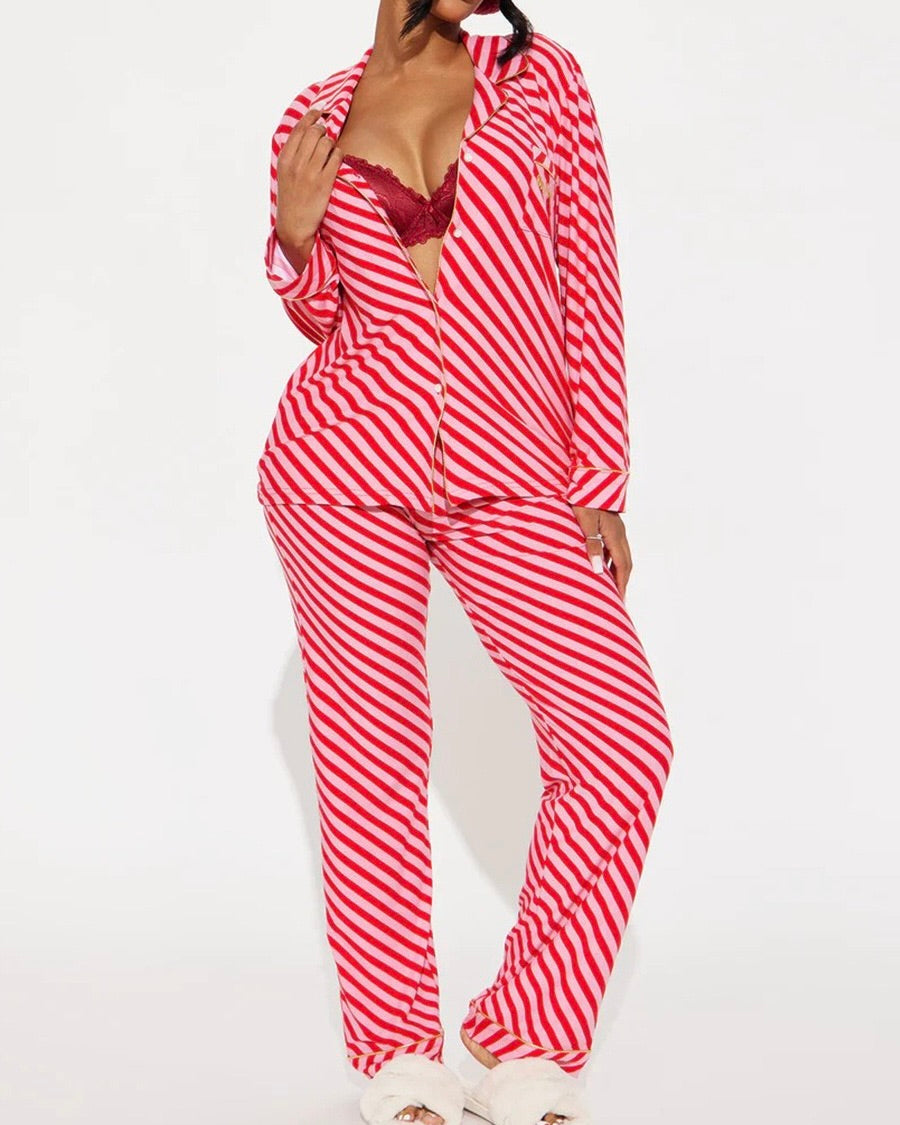 Besitos Striped Pajama Set is a flirty and cozy two-piece sleepwear set designed for cute nights in. Featuring a classic button-down long-sleeve top and matching relaxed-fit pants, this bold red stripe print brings playful energy to your bedtime and lounging looks.