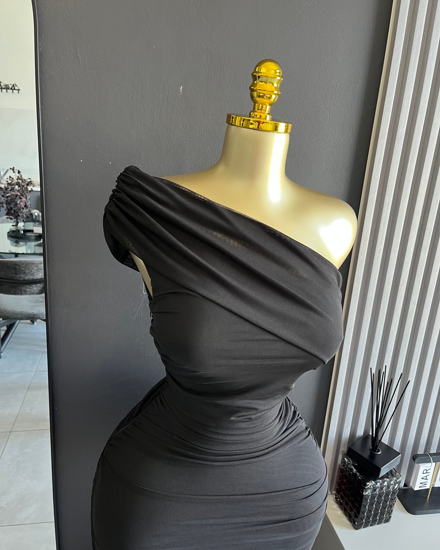 Neckline: One-shoulder asymmetrical neckline
