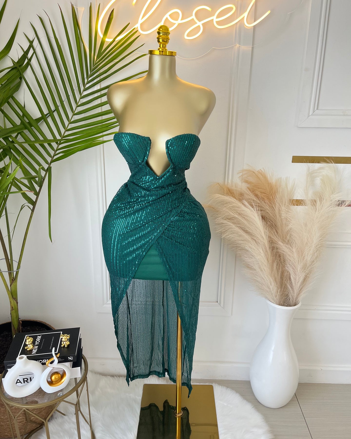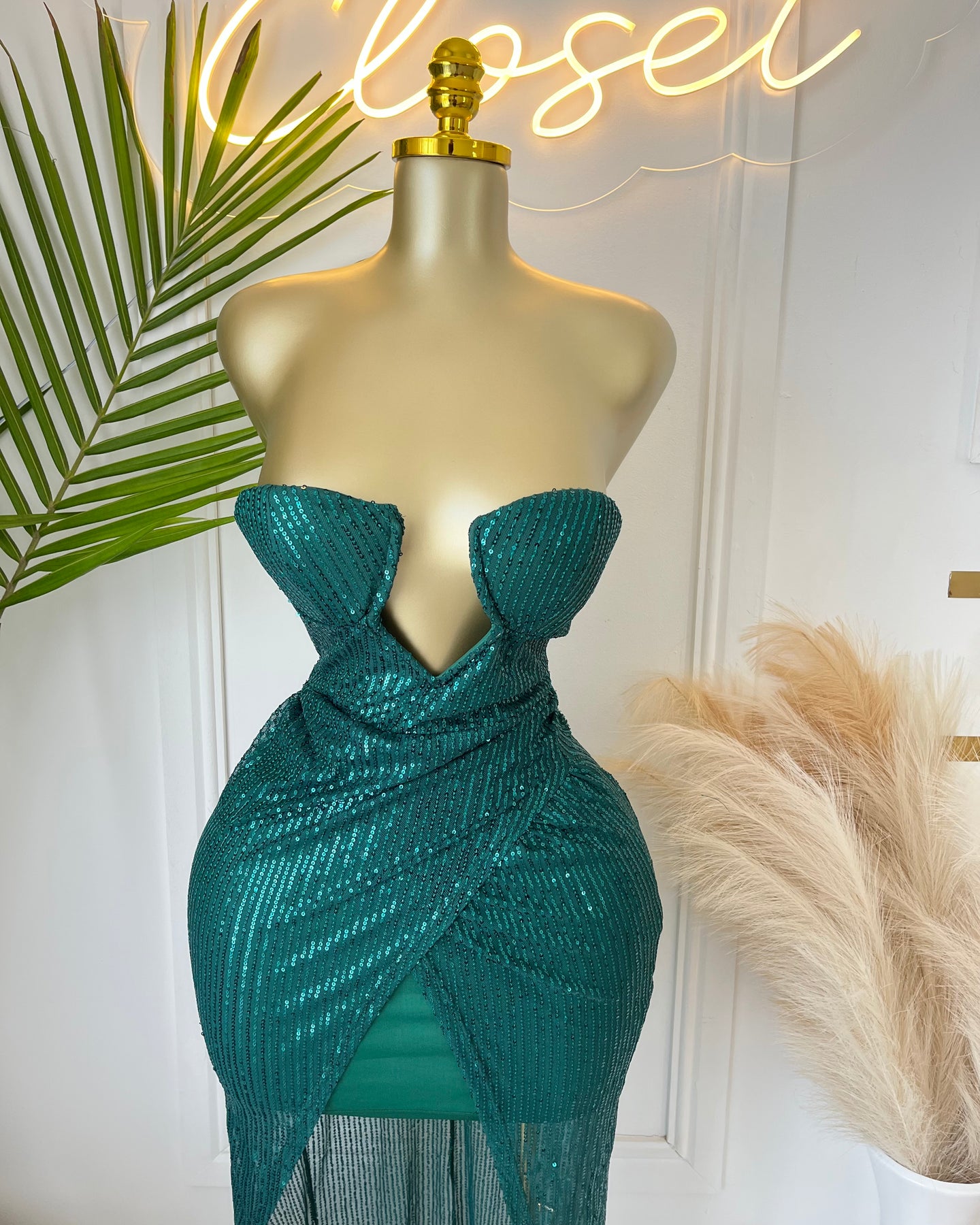 - Clothing Feature: High slit, sequin finish, figure-flattering silhouette