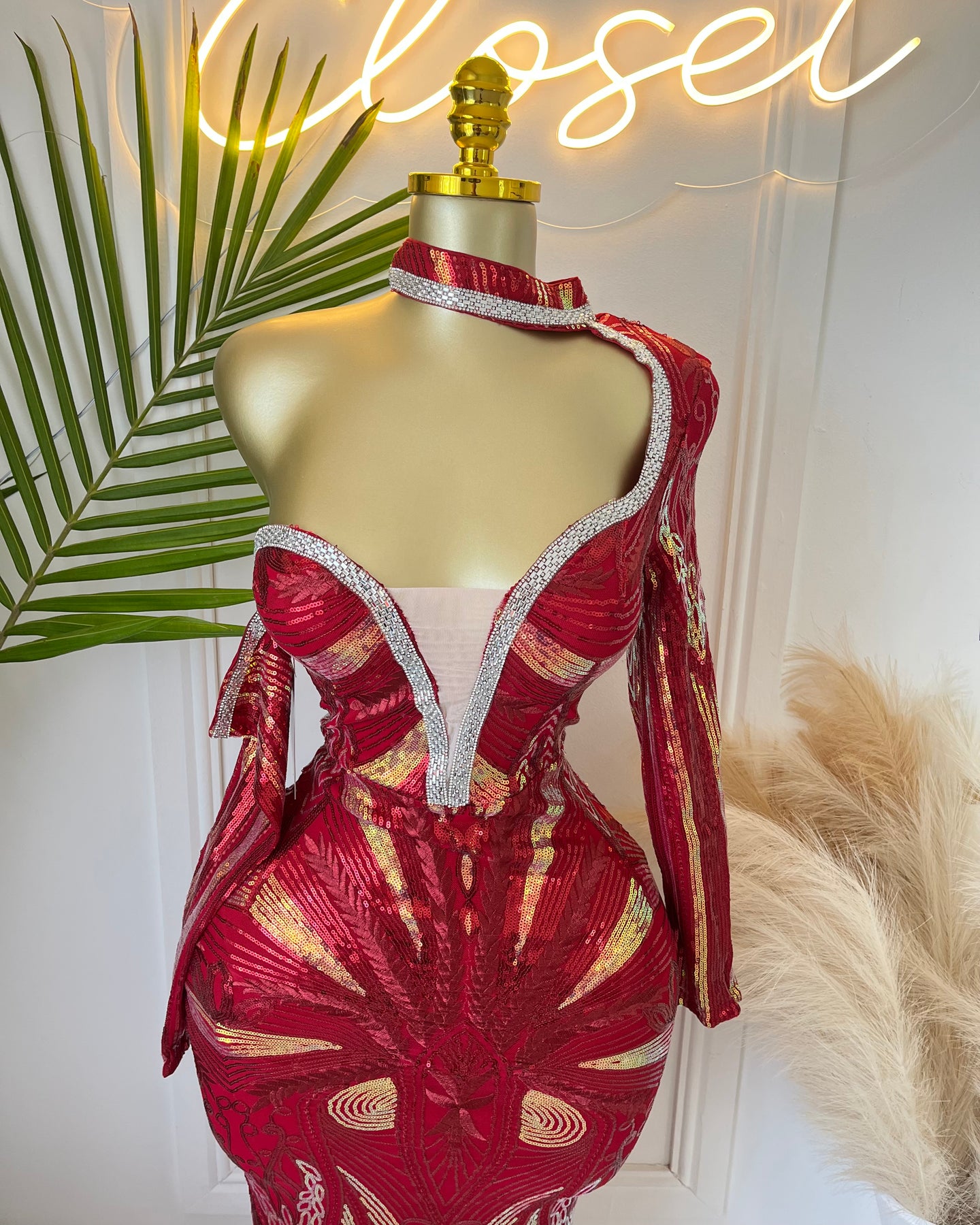 • Clothing Feature: Intricate beading, sheer accents, long sleeves