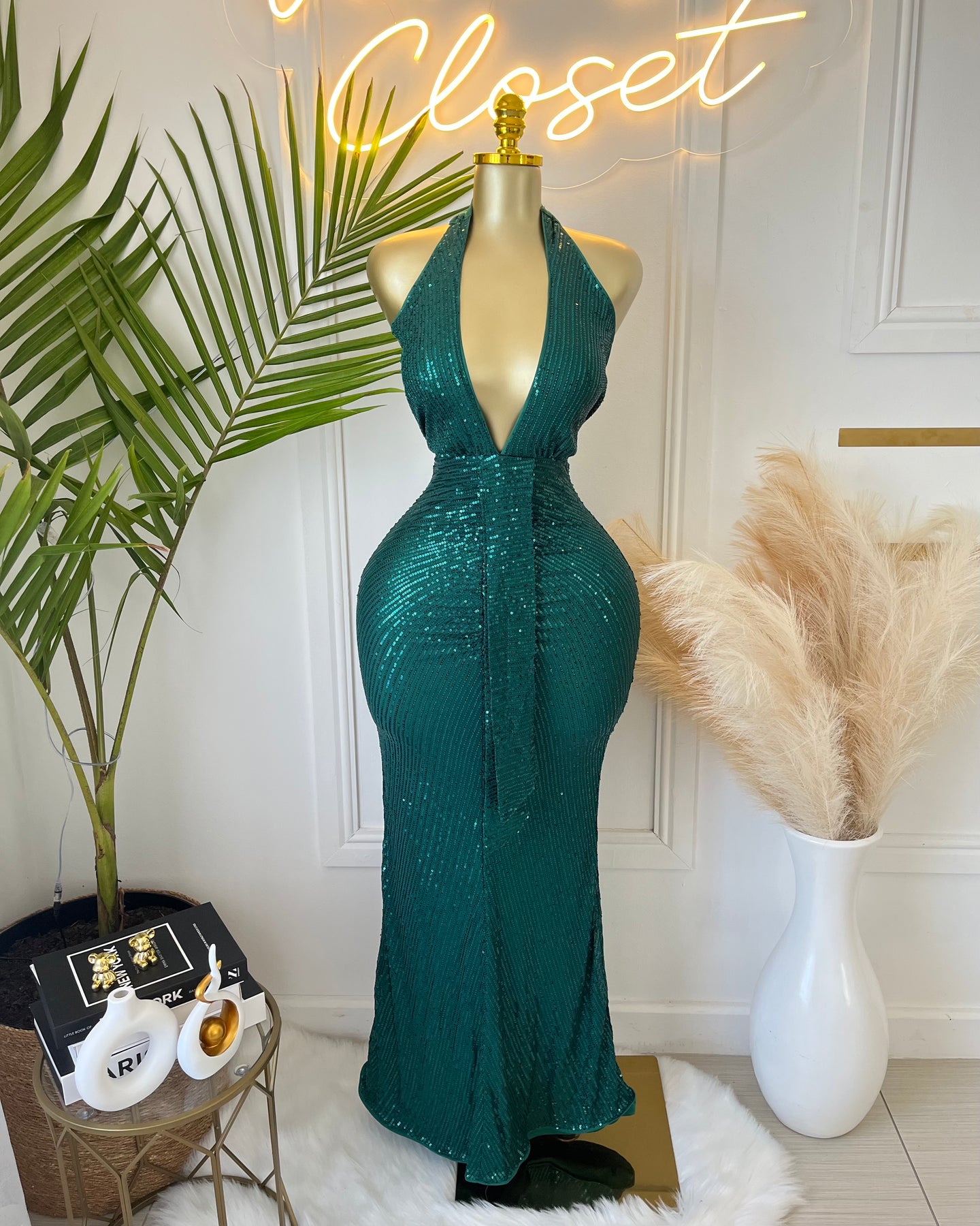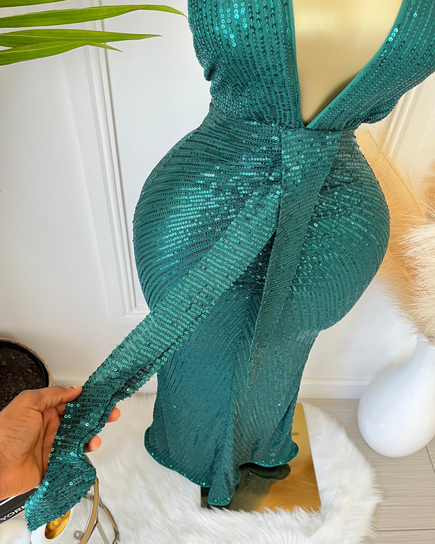 • Clothing Feature: Plunging neckline, sequin embellishments, curve-hugging fit