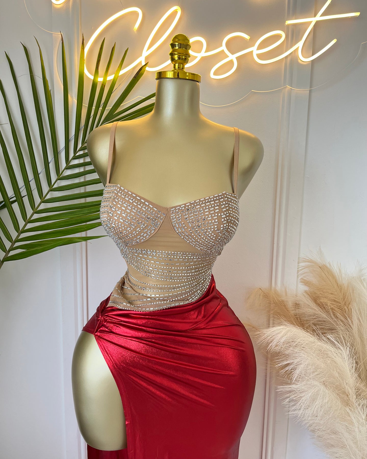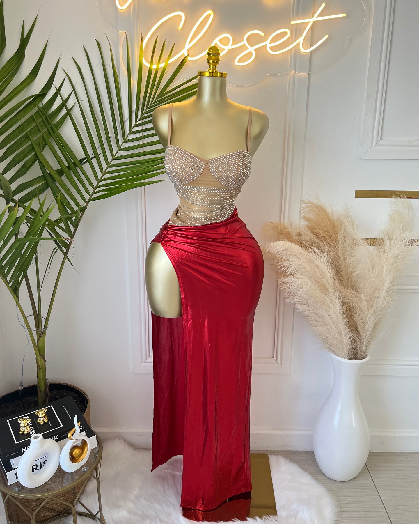 Turn heads in the Lorne High Slit Gown – a sultry, statement piece perfect for special occasions or red carpet moments. This gown features a shimmering, rhinestone-studded bodice, curve-hugging fit, and a dramatic high slit for a truly unforgettable look.