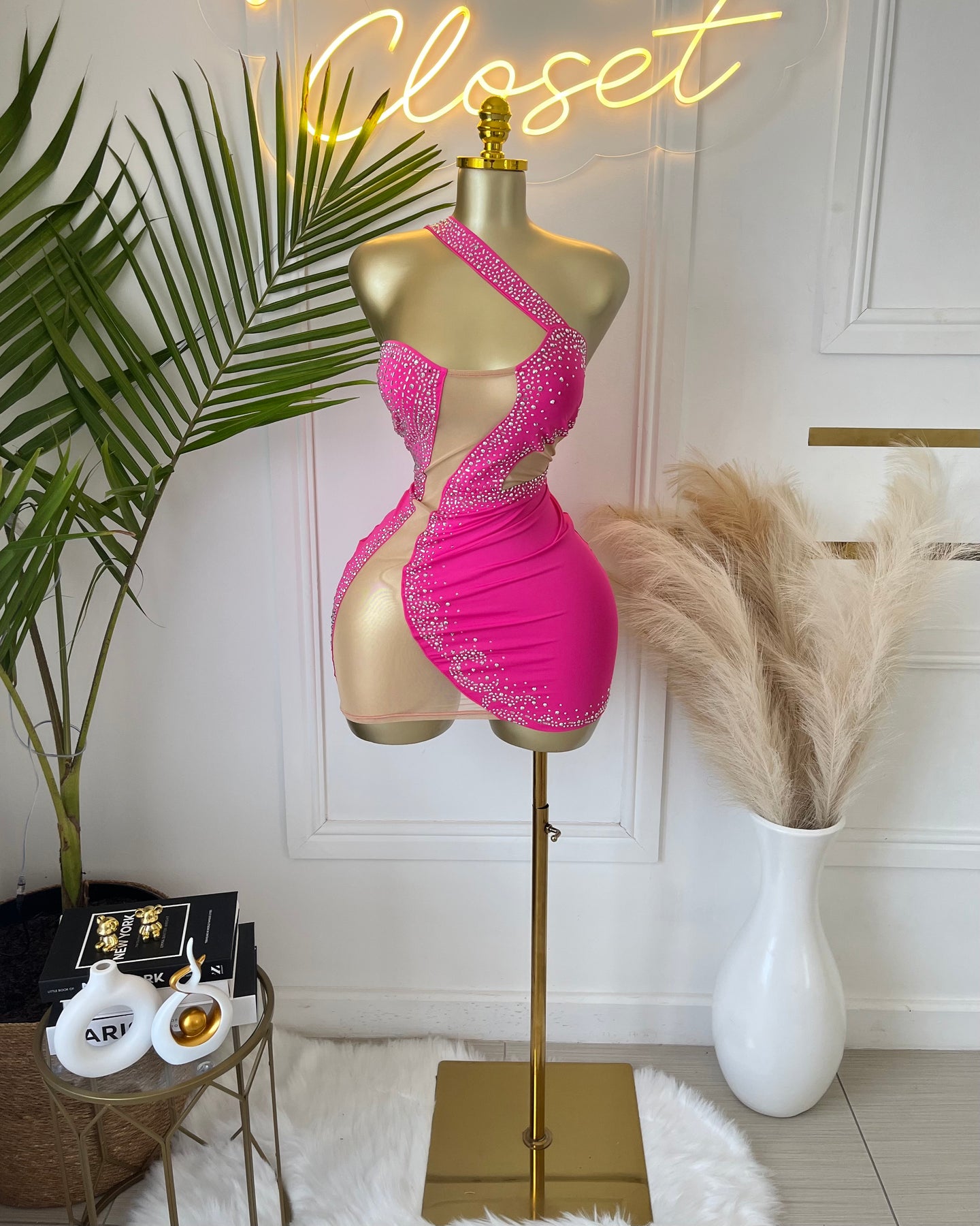 Show off your bold side with the Peek a Boo Mini Dress—a vibrant pink asymmetrical dress with sheer nude panels and dazzling rhinestone accents. Designed with medium-stretch fabric for a flattering fit, this dress is perfect for parties, date nights, or glamorous events.