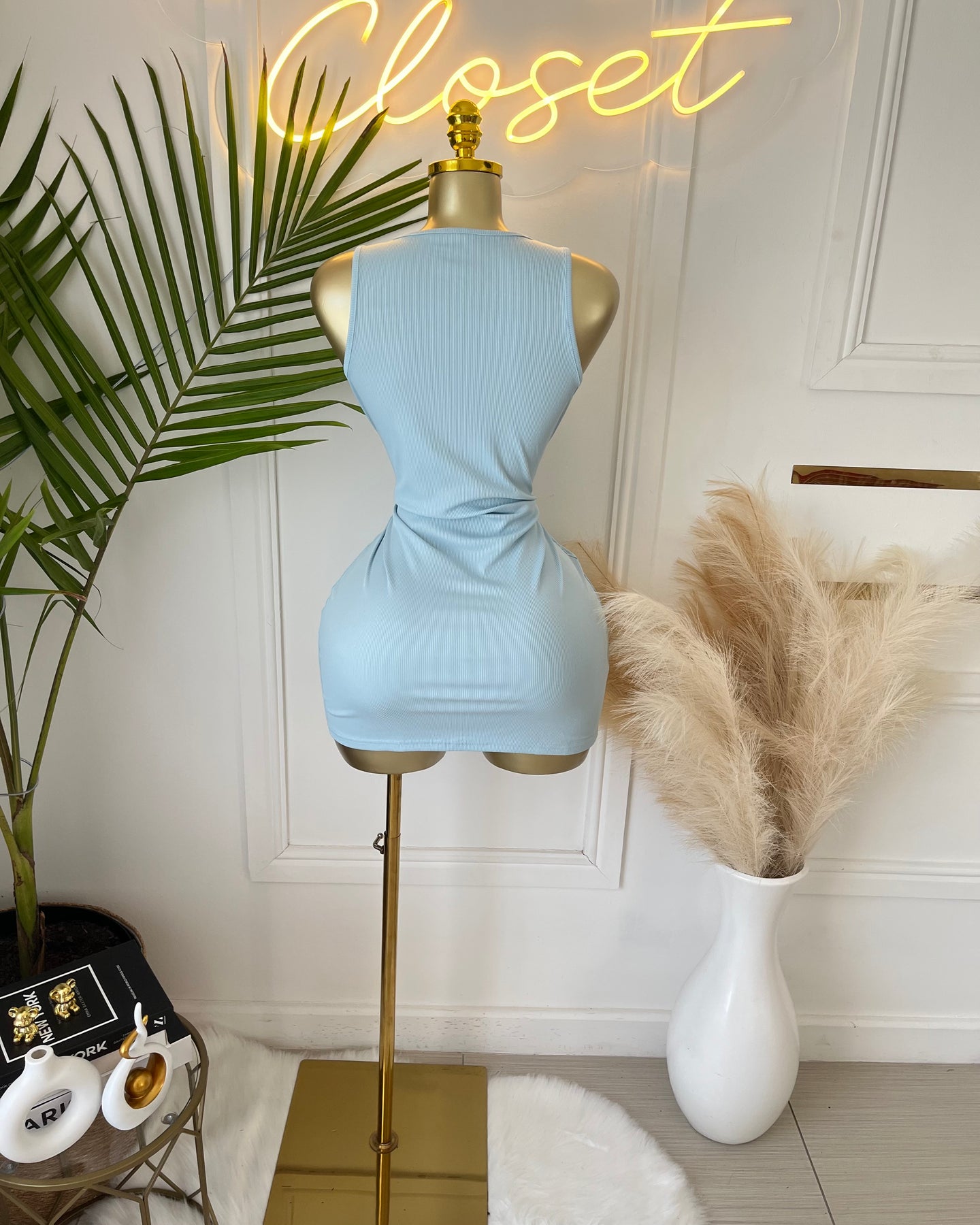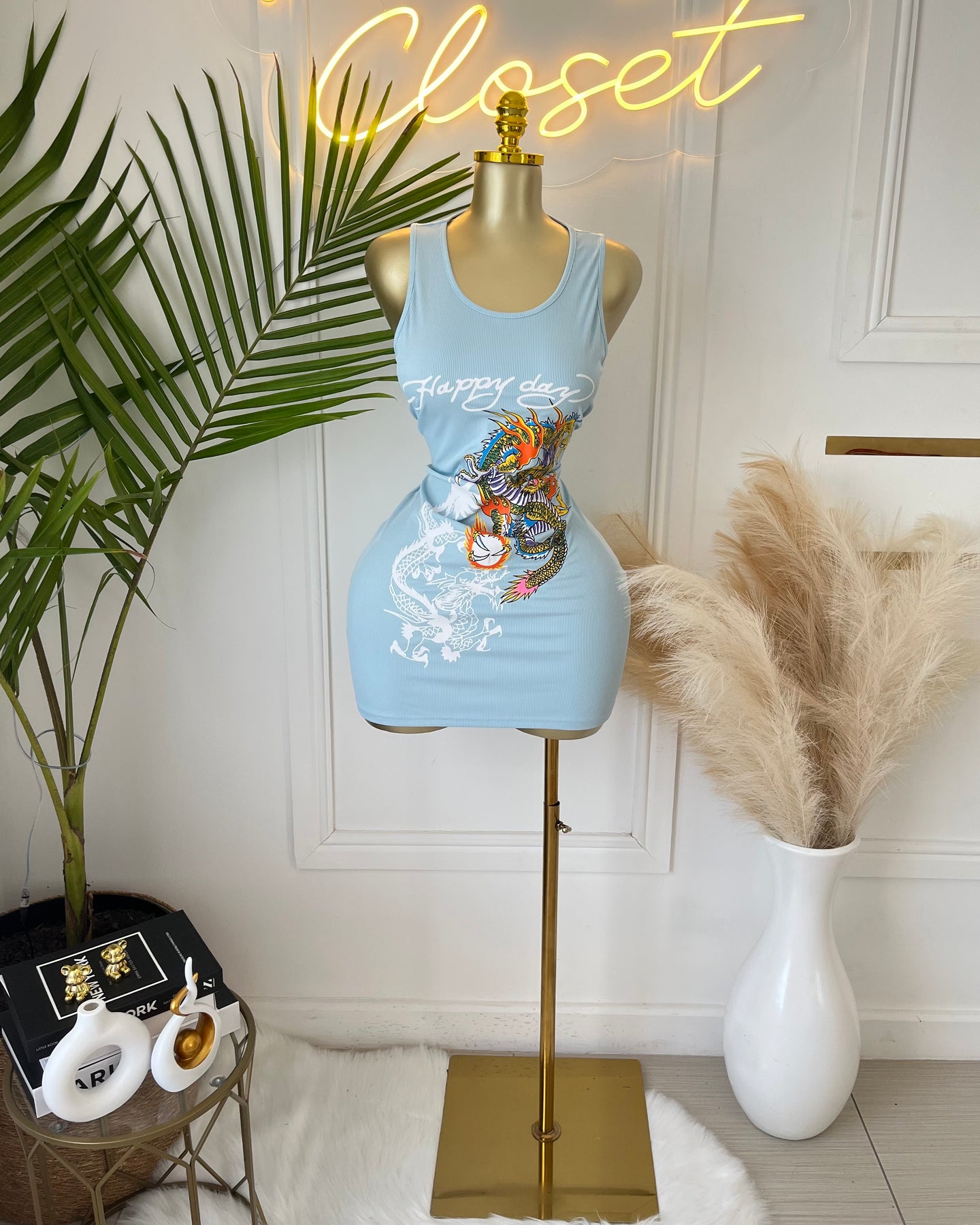 Unleash your bold side with the Rodeo Mini Dress—a playful and trendy graphic tank dress in a light blue shade. Featuring a vibrant dragon print and "Happy Day" text, this medium-stretch dress offers comfort and style for casual outings, parties, or vacations.