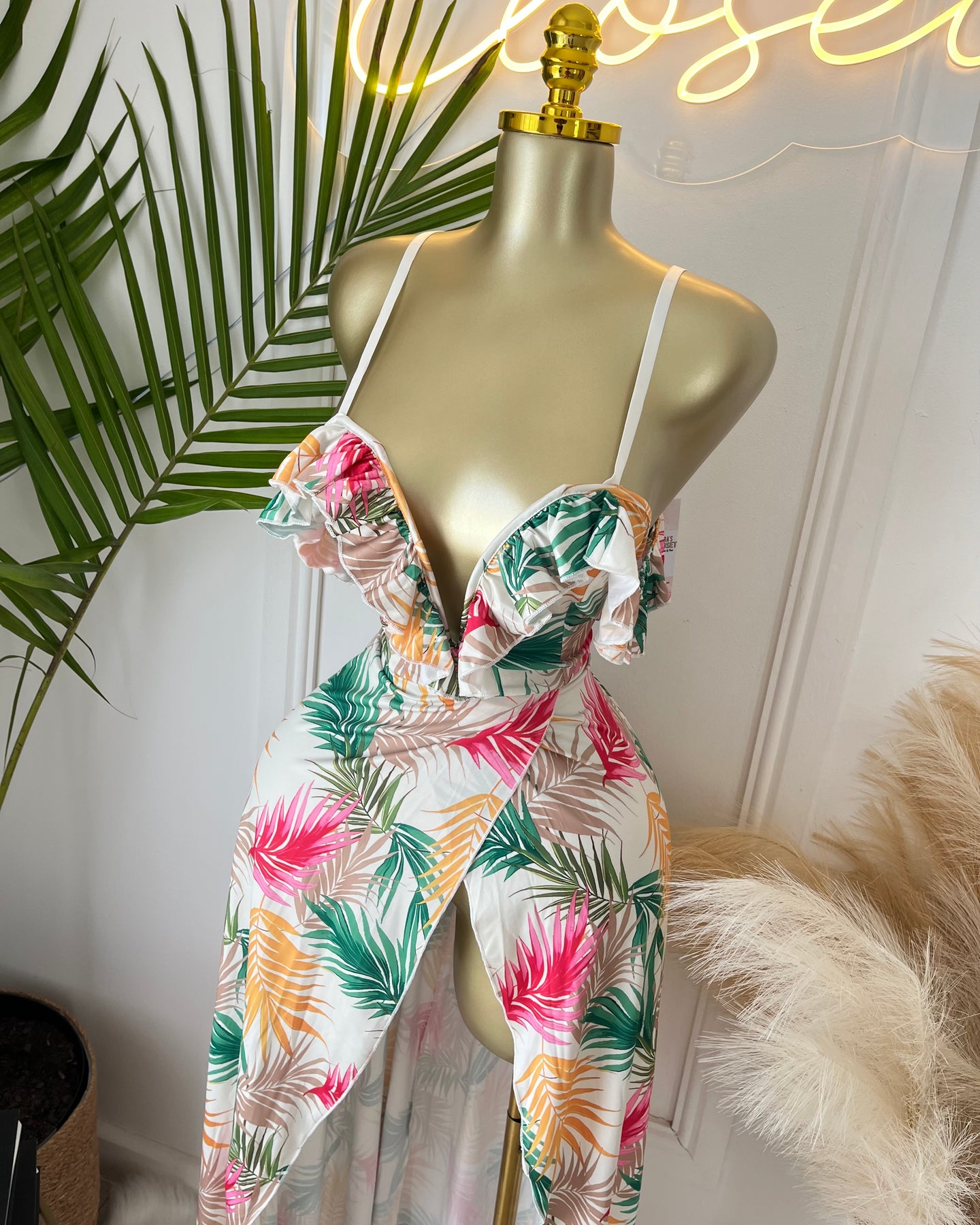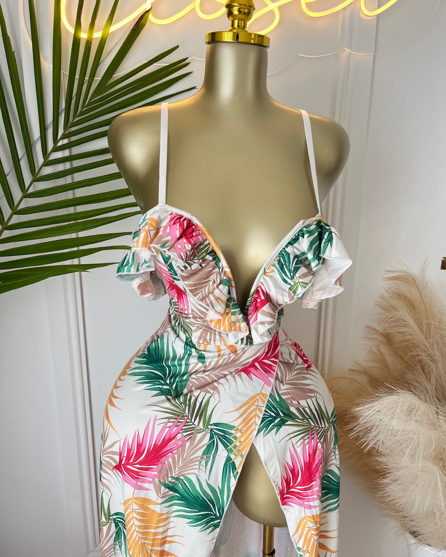 Turn heads this summer in the Tropical Breeze Maxi Dress. With a vibrant palm leaf print and breezy silhouette, this maxi dress is perfect for beachside brunches, tropical getaways, and sunset strolls. Feel the vacation vibes with every step.