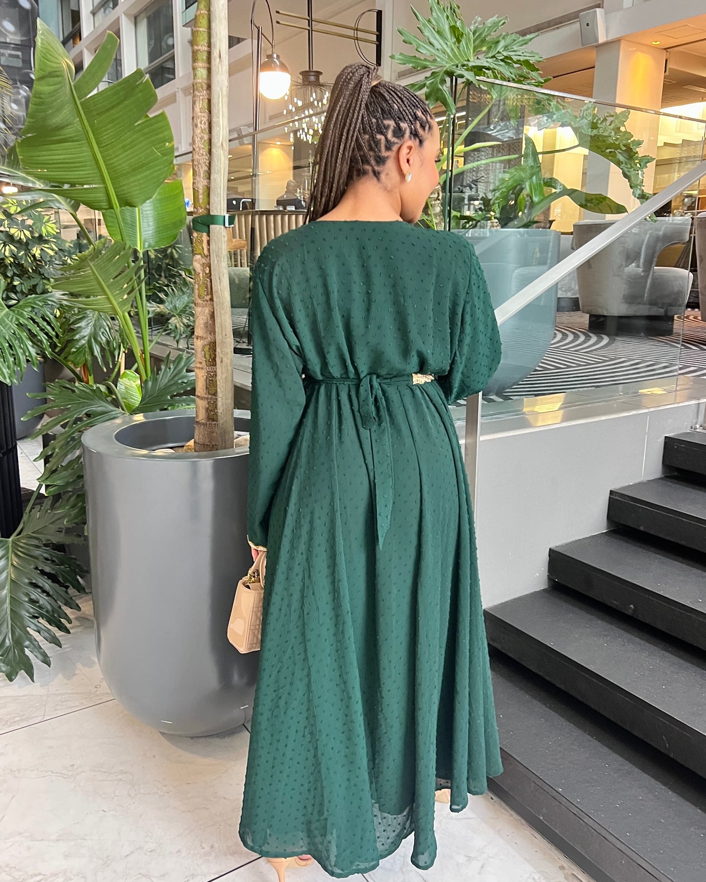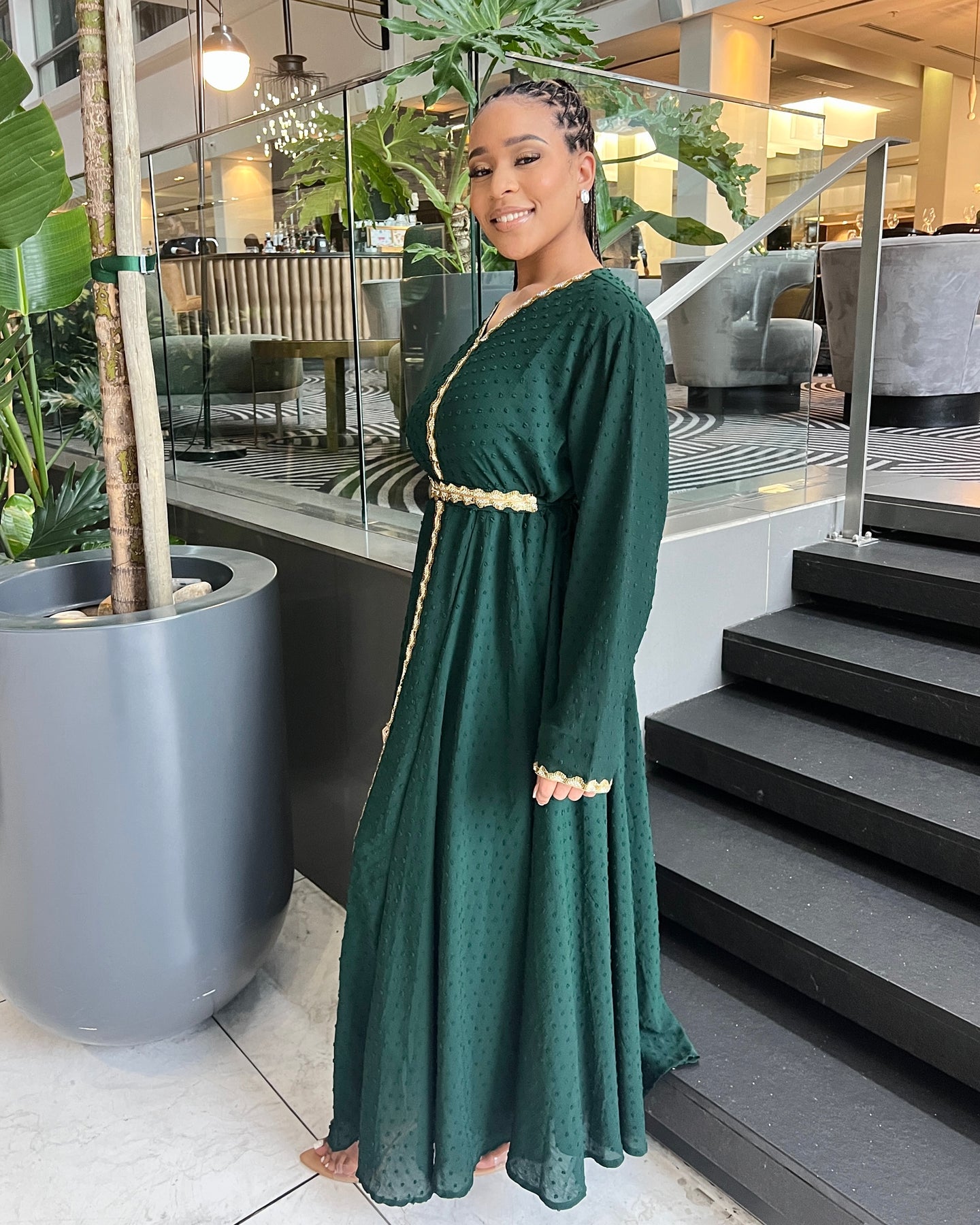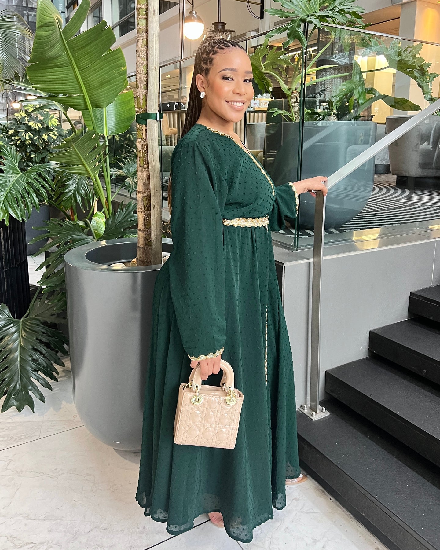 Exude grace in the Golden Emerald Bubu—a flowing kaftan detailed with gold embroidery that brings effortless luxury to formal and special occasions.