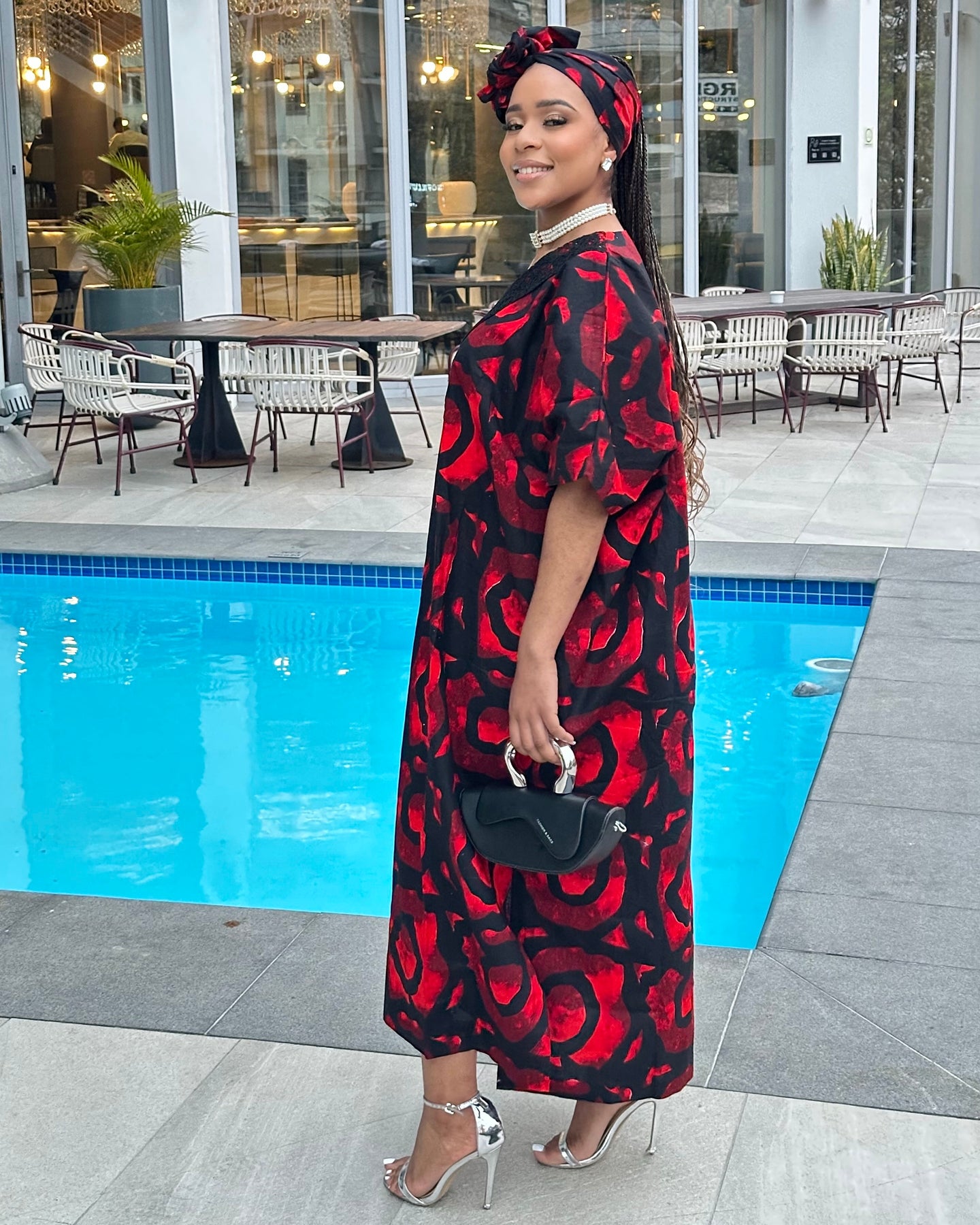 - Clothing Feature: Lace neckline accent, bold red print, matching headwrap