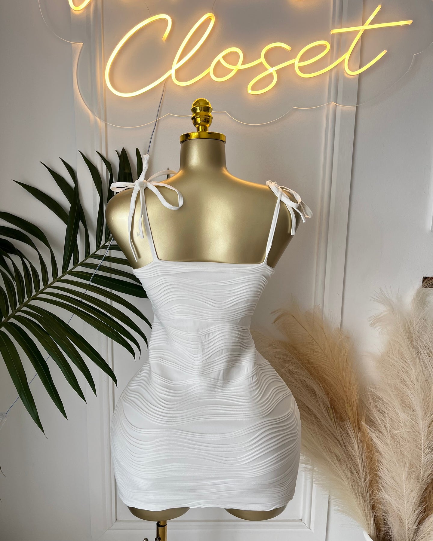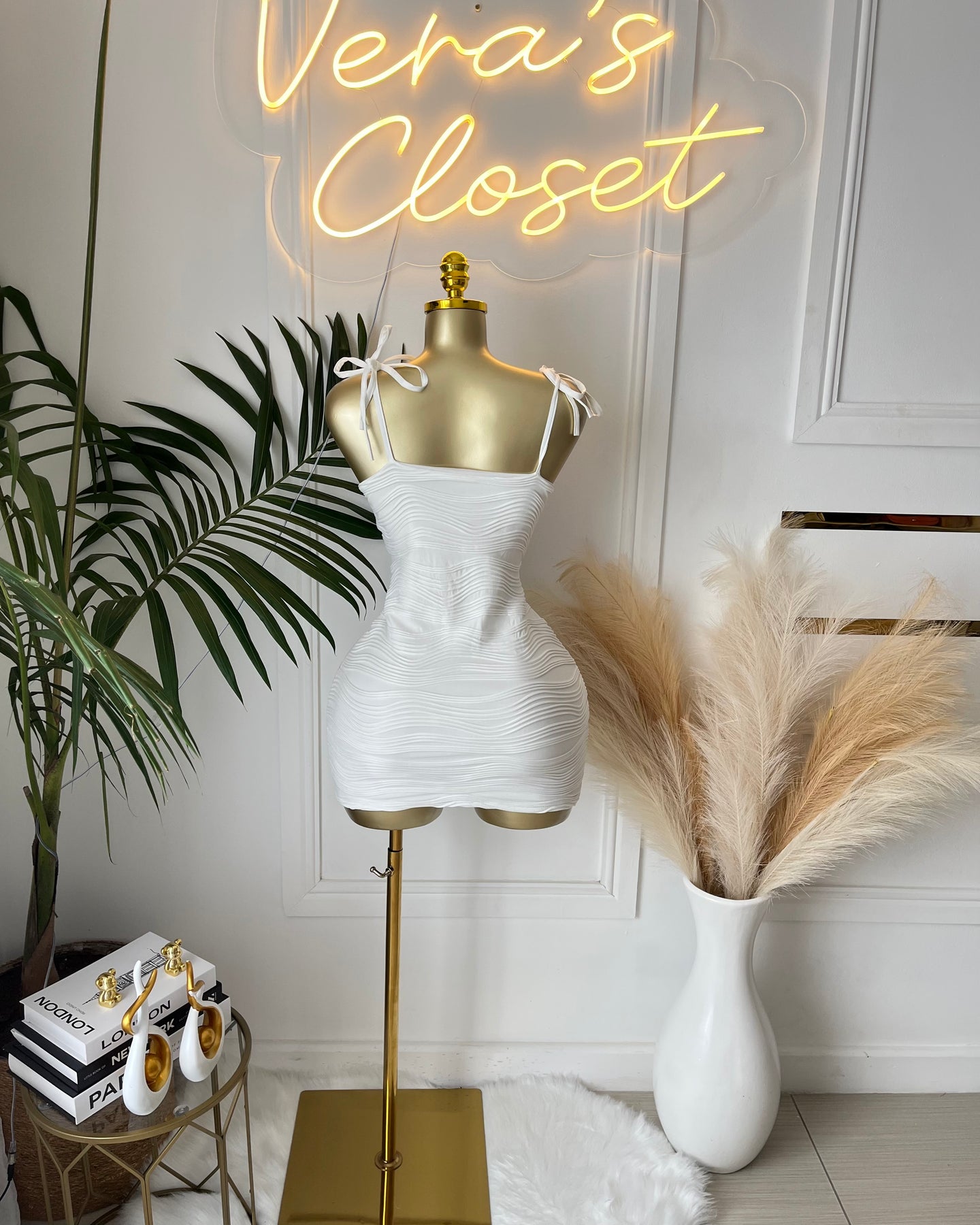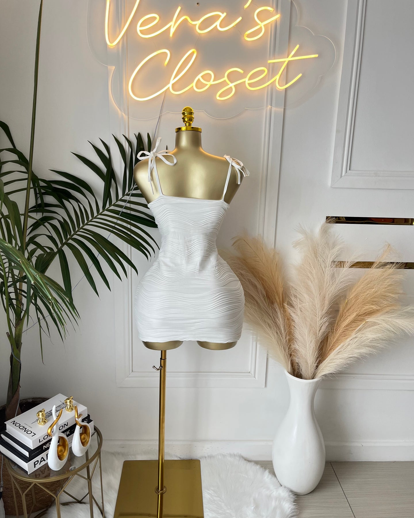The Ava White Ruched Mini Dress is your new go-to for date nights and special occasions. Featuring ruched detailing, tie-up straps, and a curve-hugging fit that flatters every angle. 💫