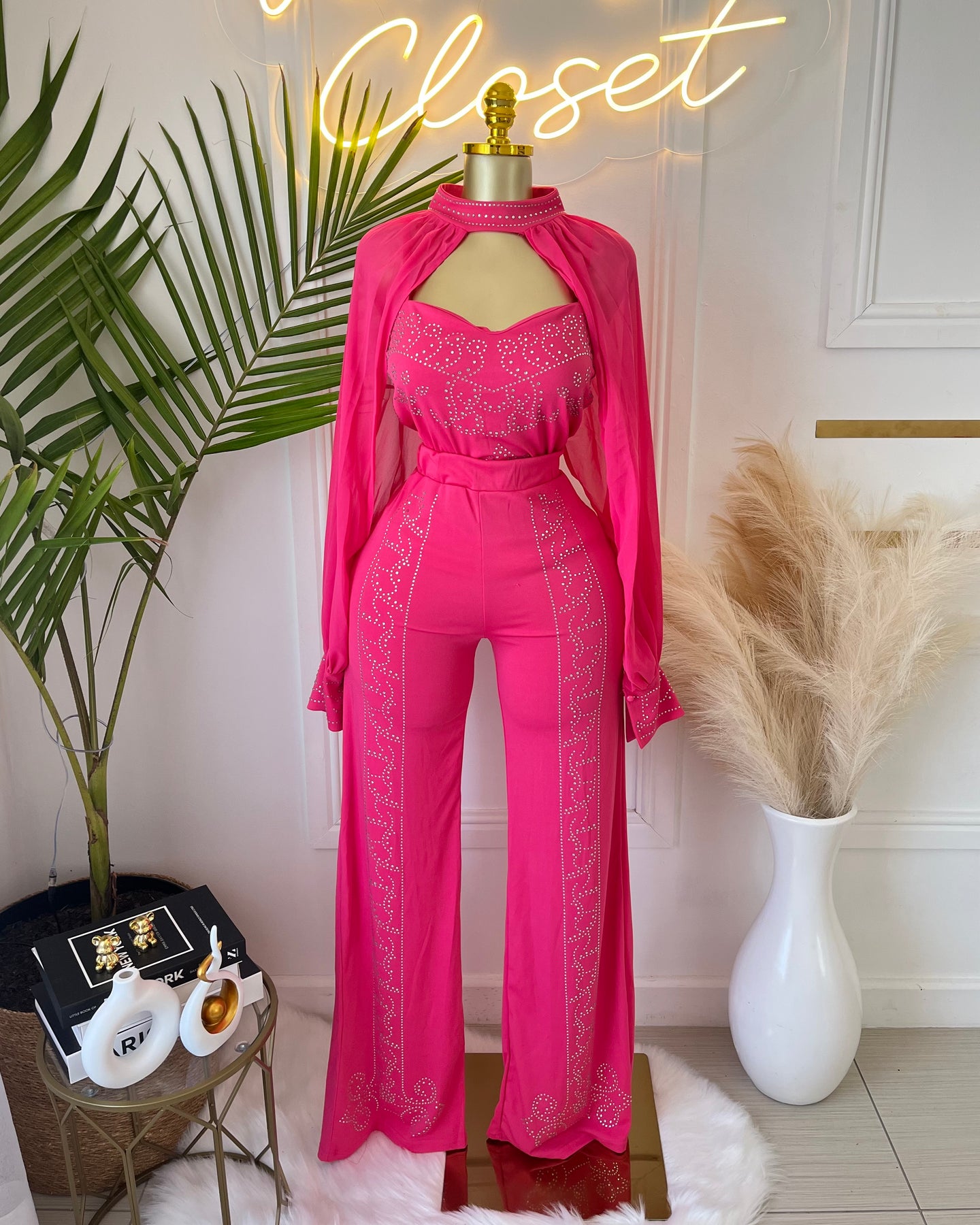 Elevate your style with the Pure Glam Pant Set, featuring an embellished top and flared pants. This statement set offers a relaxed fit with a good stretch, perfect for making a bold fashion statement at any event.