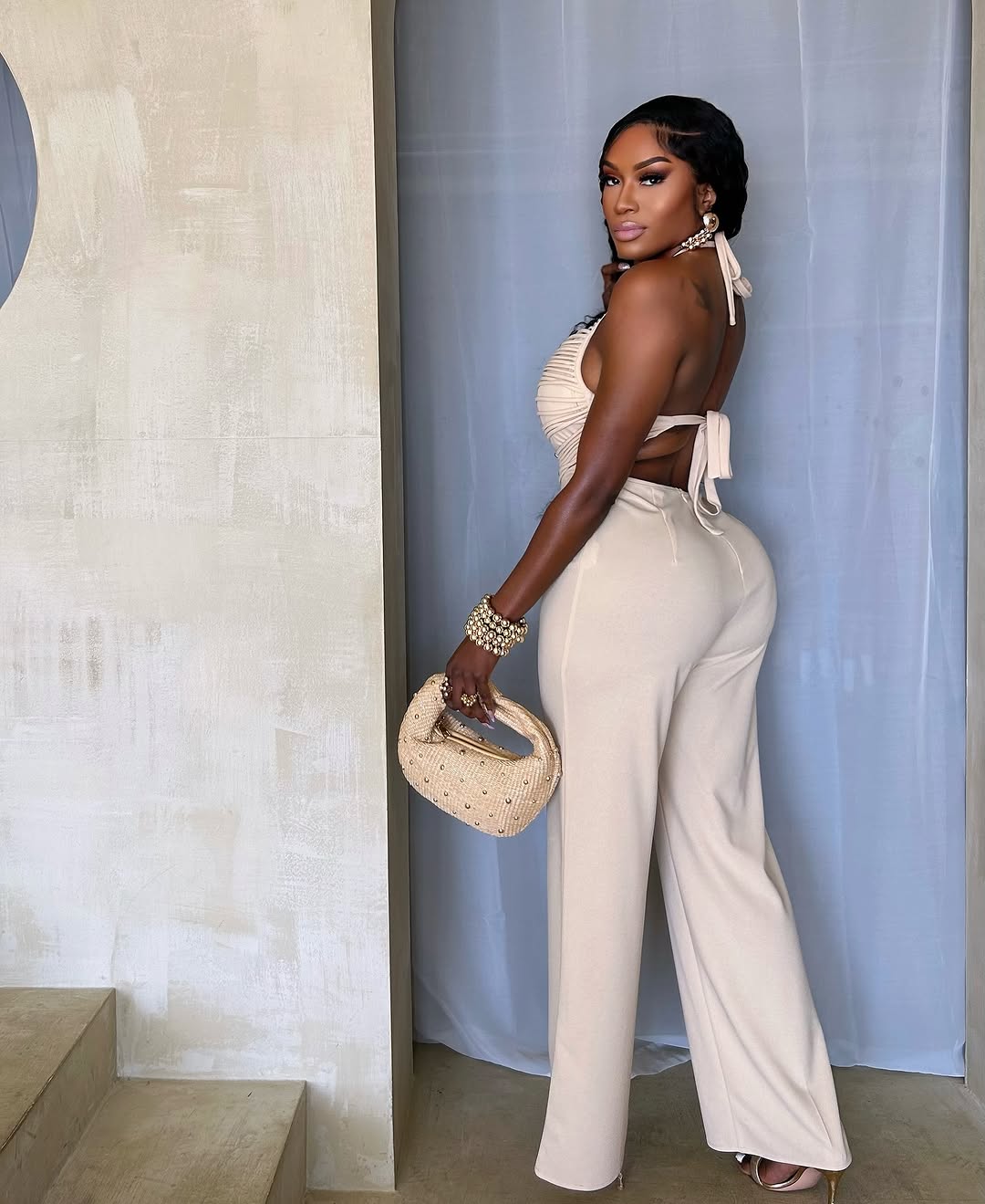 Glow like golden hour in the Sahara Beaded Halter Jumpsuit — a luxe, wide-leg silhouette with stunning bead detail. Made for milestones and glam nights out.