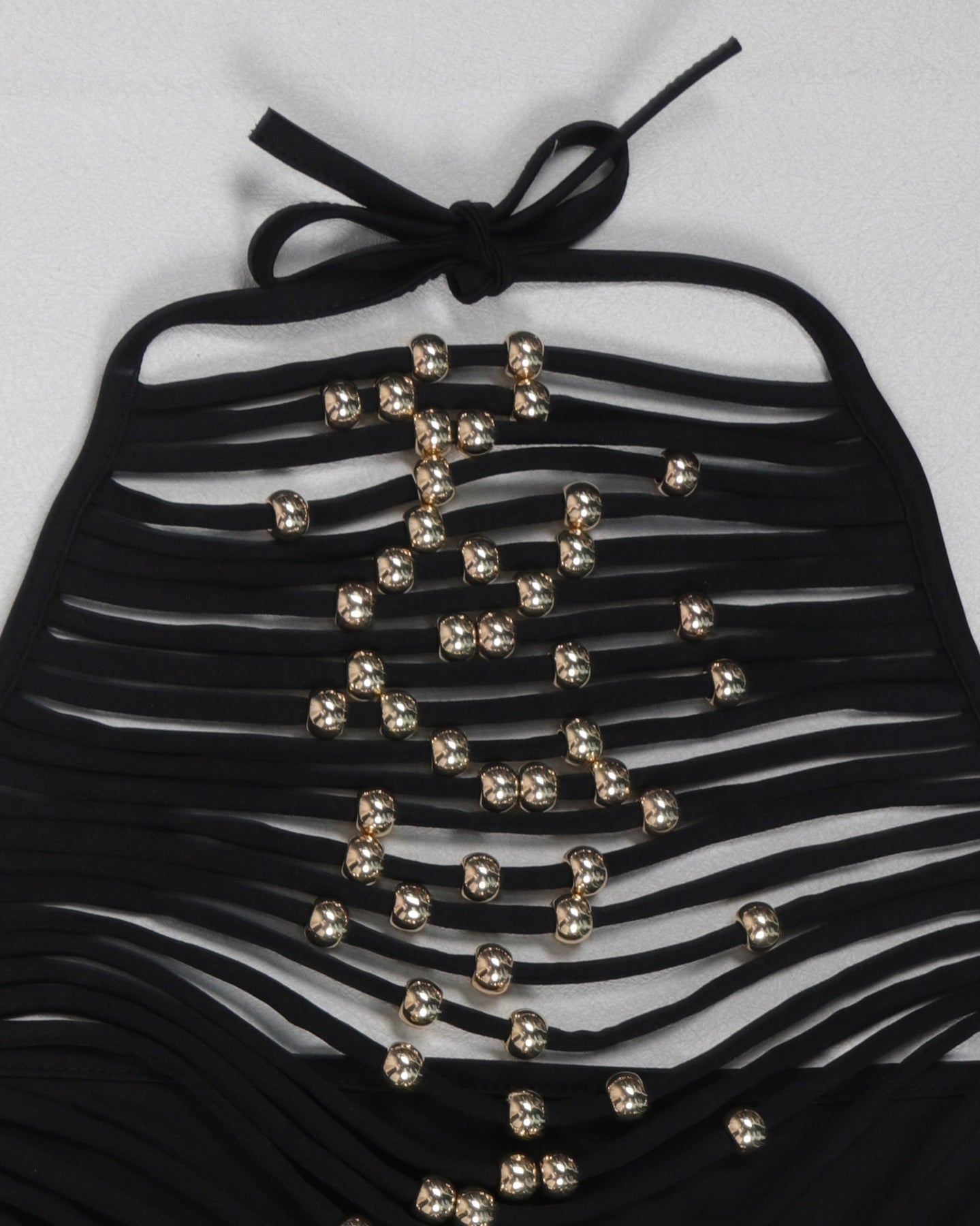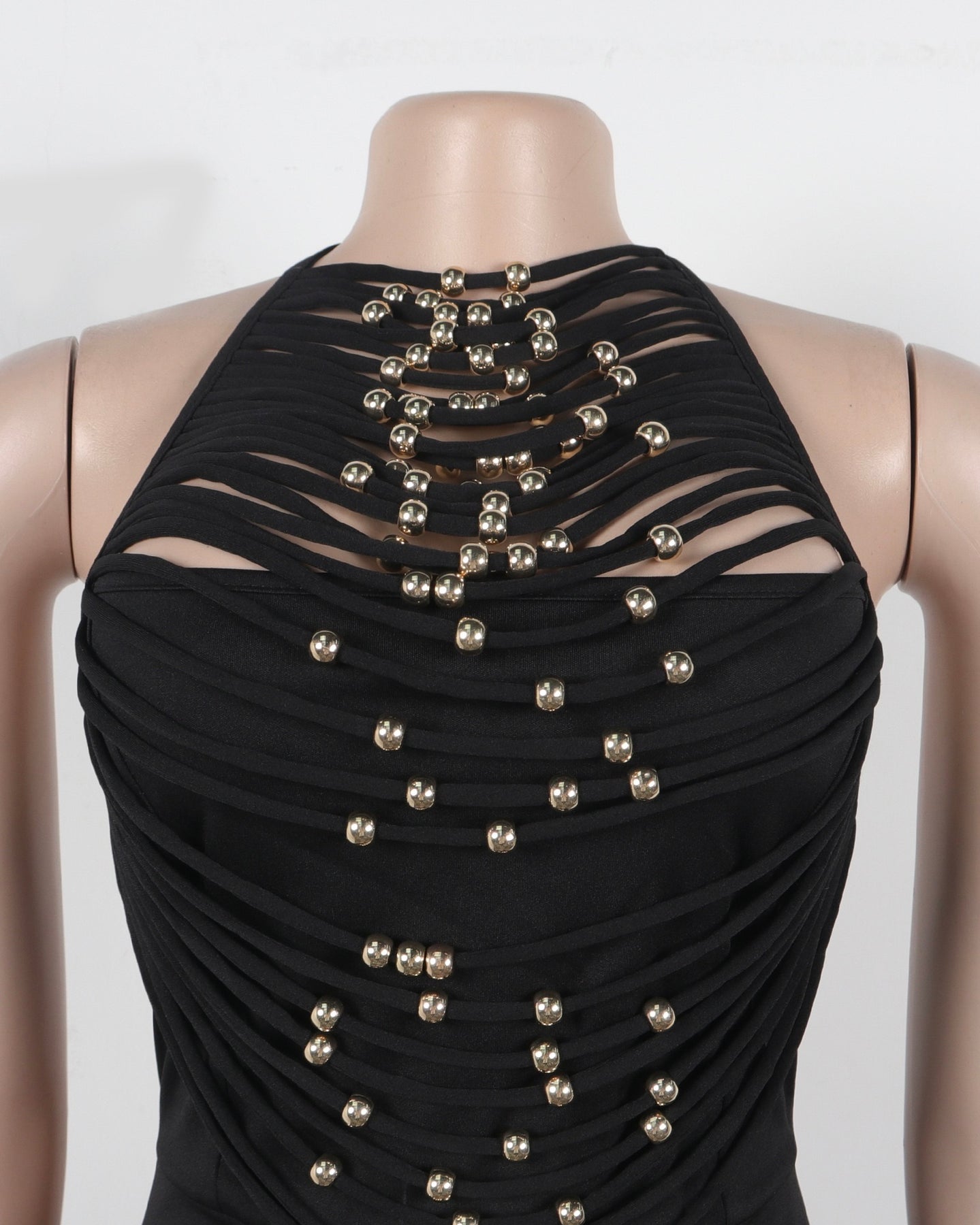 • Clothing Feature: Beaded halter neckline, Ruched bodice, Wide leg fit