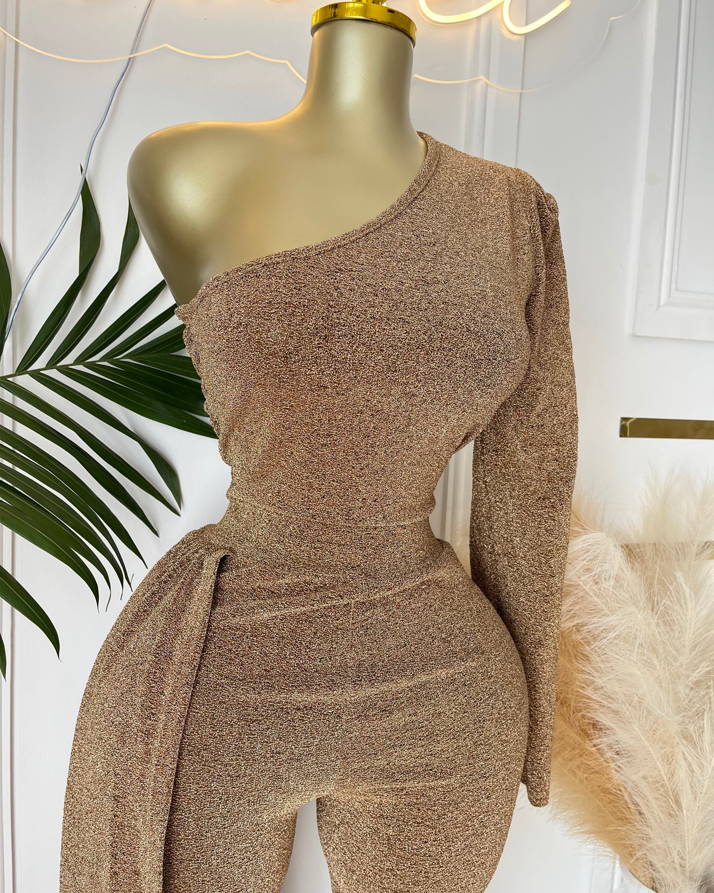 Step into elegance with the Vera Luxe Jumpsuit. Featuring a one-shoulder design and a cascading drape detail, this glittering jumpsuit is perfect for making a statement at any event. The low stretch fabric and fitted silhouette create a chic and sophisticated look.