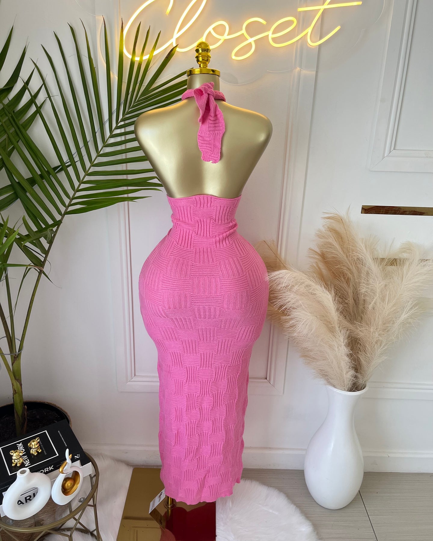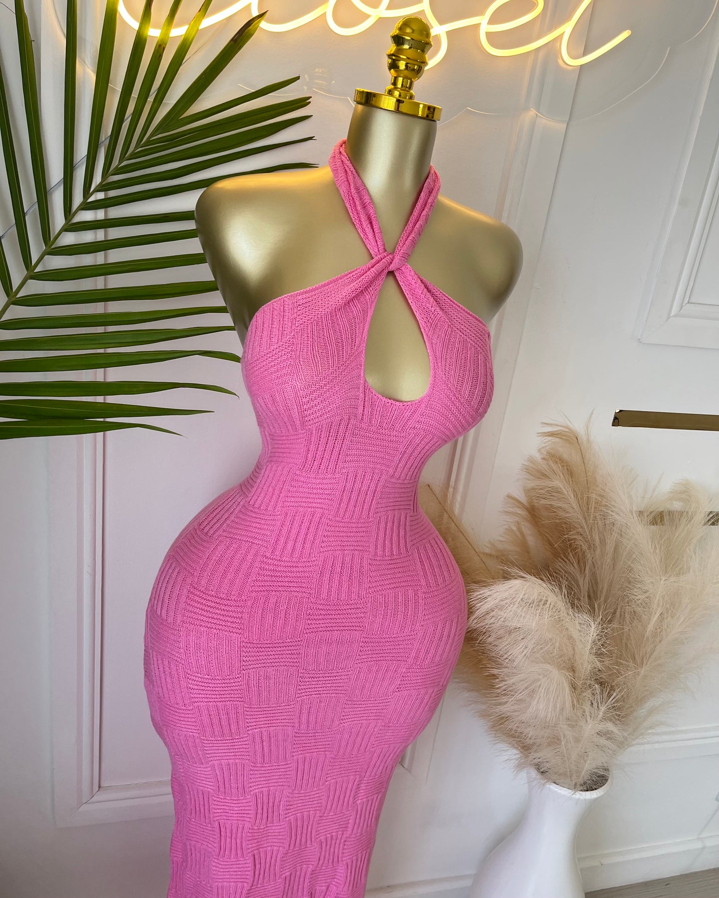 Step out in style with the Sabrina Midi Dress – a perfect blend of elegance and edge. This bodycon midi dress features a flattering halter neckline and textured fabric that hugs your curves in all the right places, making it a must-have for special occasions and stylish nights out.
