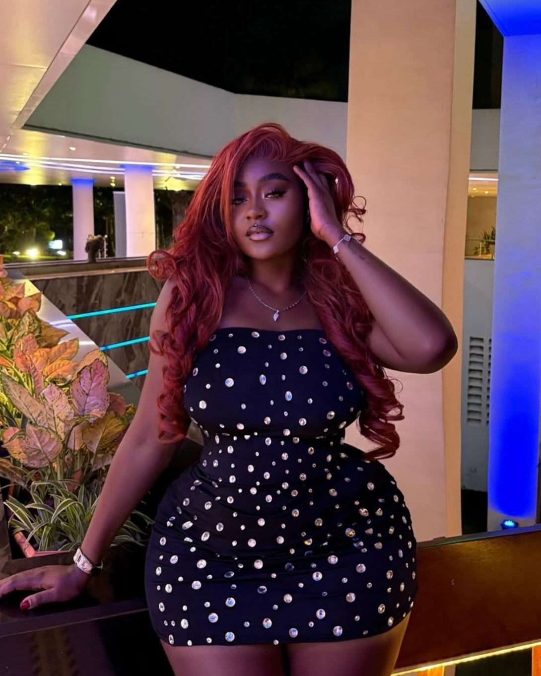 Adora is your shine moment. A strapless black mini scattered with rhinestones, sculpting your curves for glam nights out and birthday dinners.