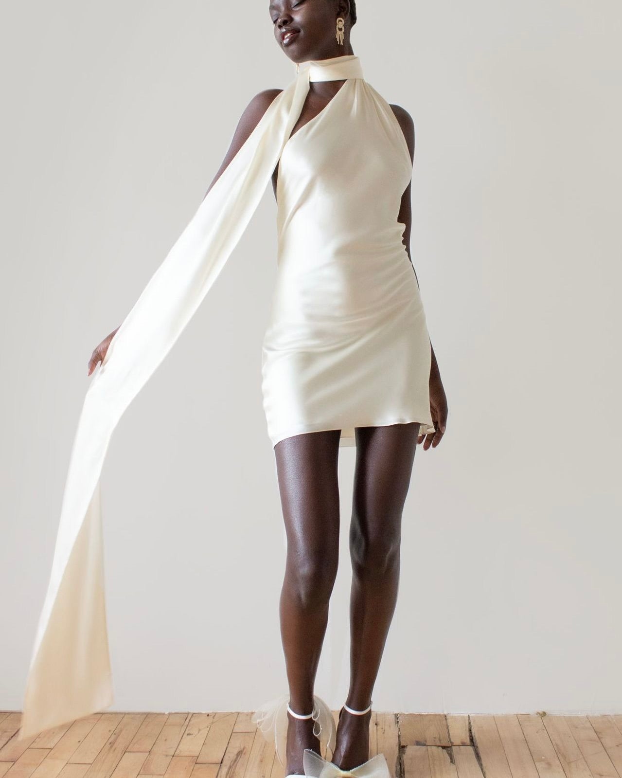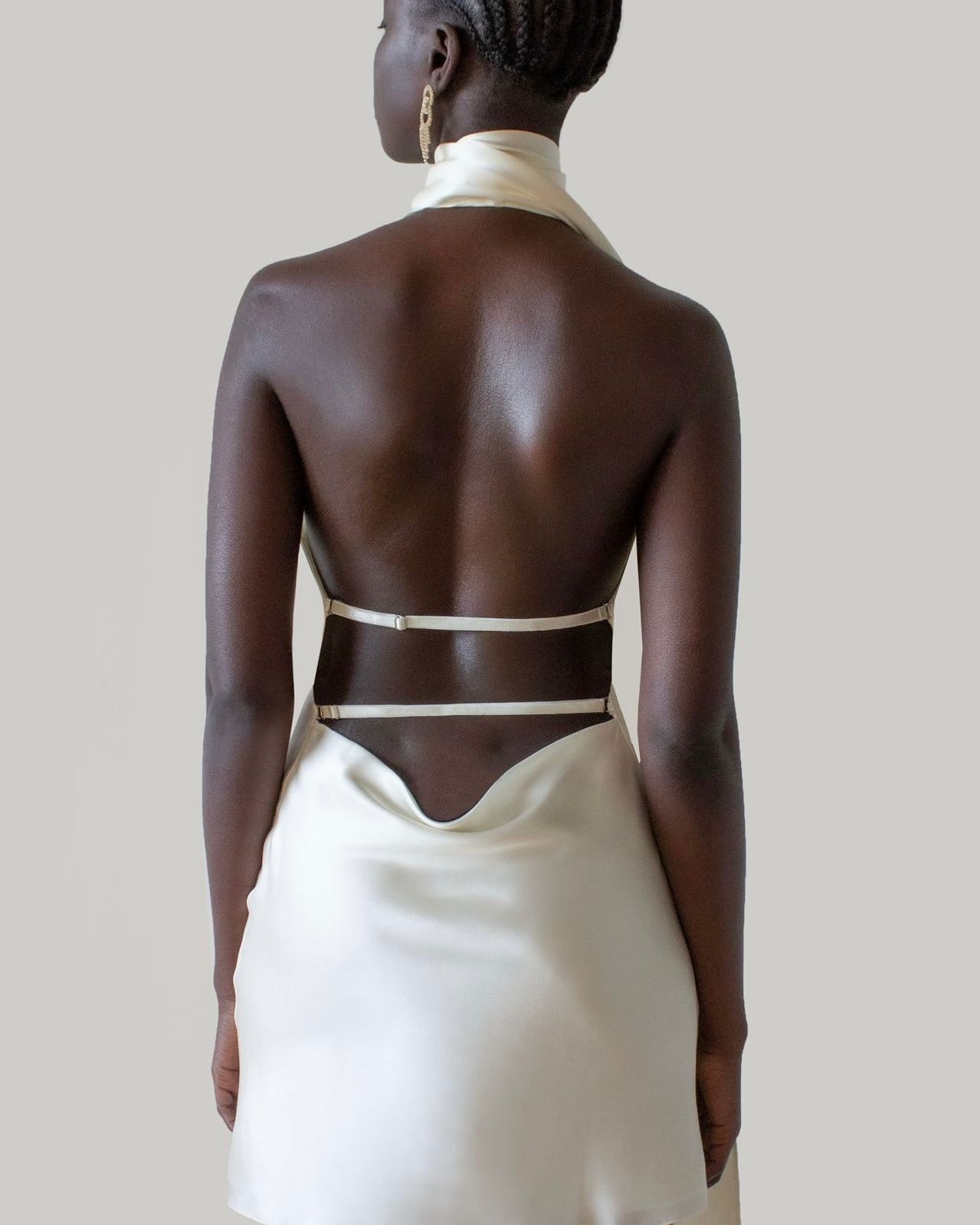 • Clothing Features: Draped scarf neckline, open shoulder detail, smooth satin finish, minimalist cut