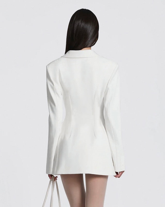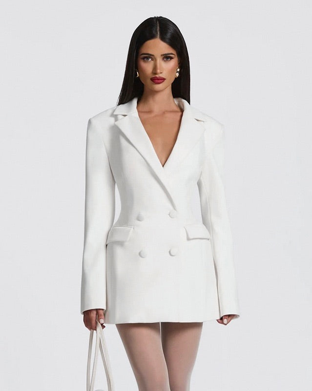 Elyndra Structured Blazer Mini Dress is the ultimate power-glam statement. With a sculpted silhouette, sharp shoulders, and double-breasted tailoring, she transforms any night into a runway moment.