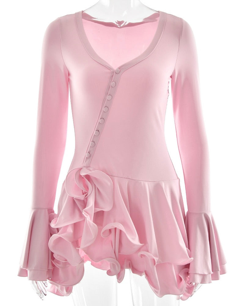 Mallory Blush Ruffle Mini Dress is a flirty blush pink mini dress made to celebrate you. Designed with soft ruffled layers and statement flare sleeves, this look brings playful glam to birthdays and special moments.