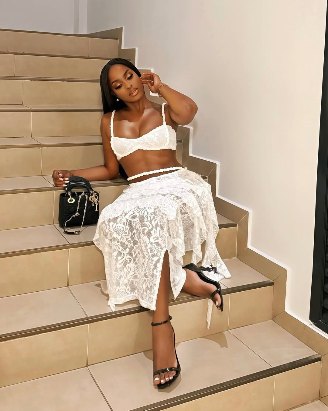 Romance meets elegance in the Celeste Lace Skirt Set—a dreamy white lace set with a bandeau top and layered maxi skirt. Perfect for vacation or glam evenings.