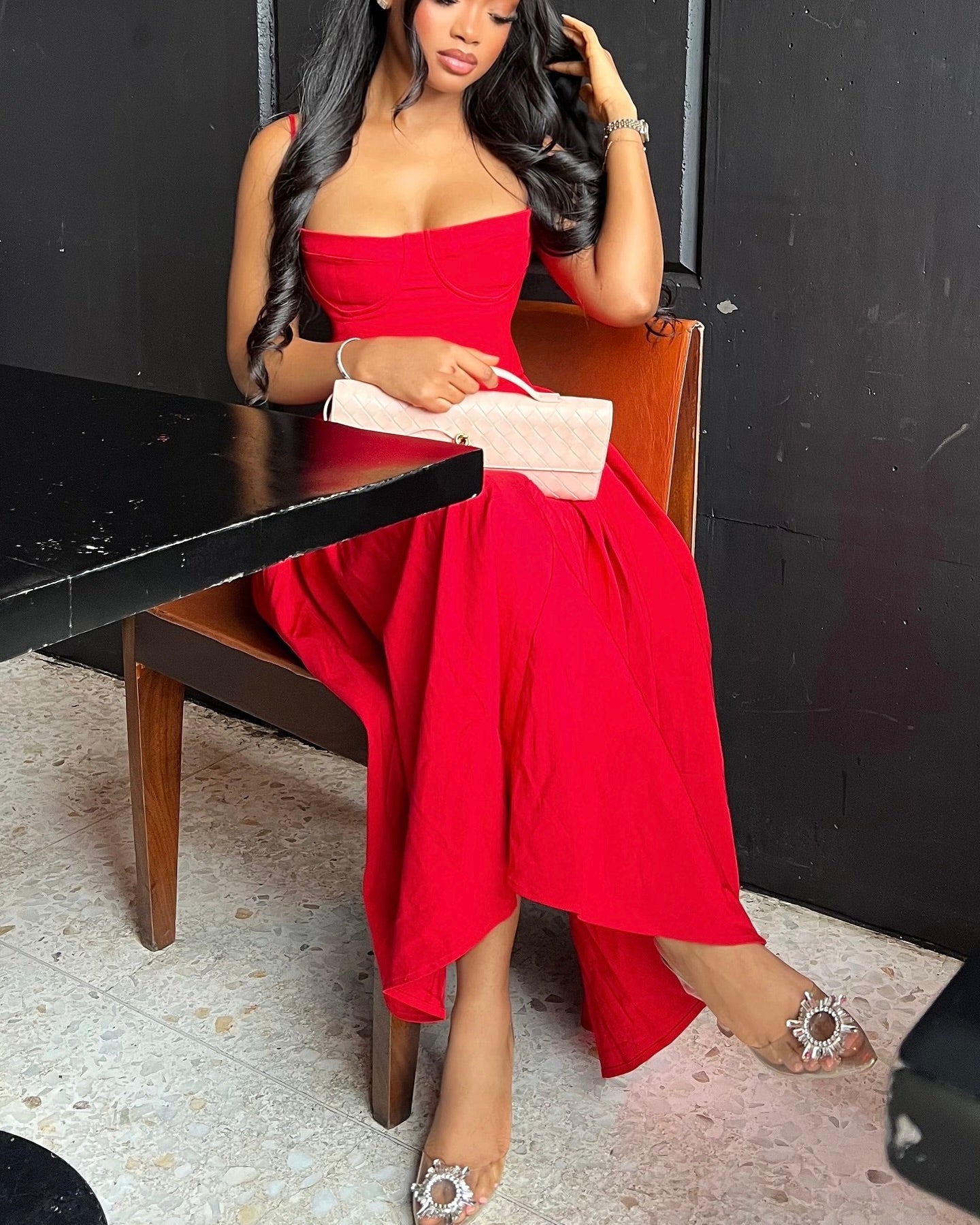 Esta Elegant Red Midi Dress is the definition of timeless femininity. Designed with a structured strapless bodice and a flowy midi-length skirt, this dress creates a soft yet sophisticated silhouette that flatters effortlessly.