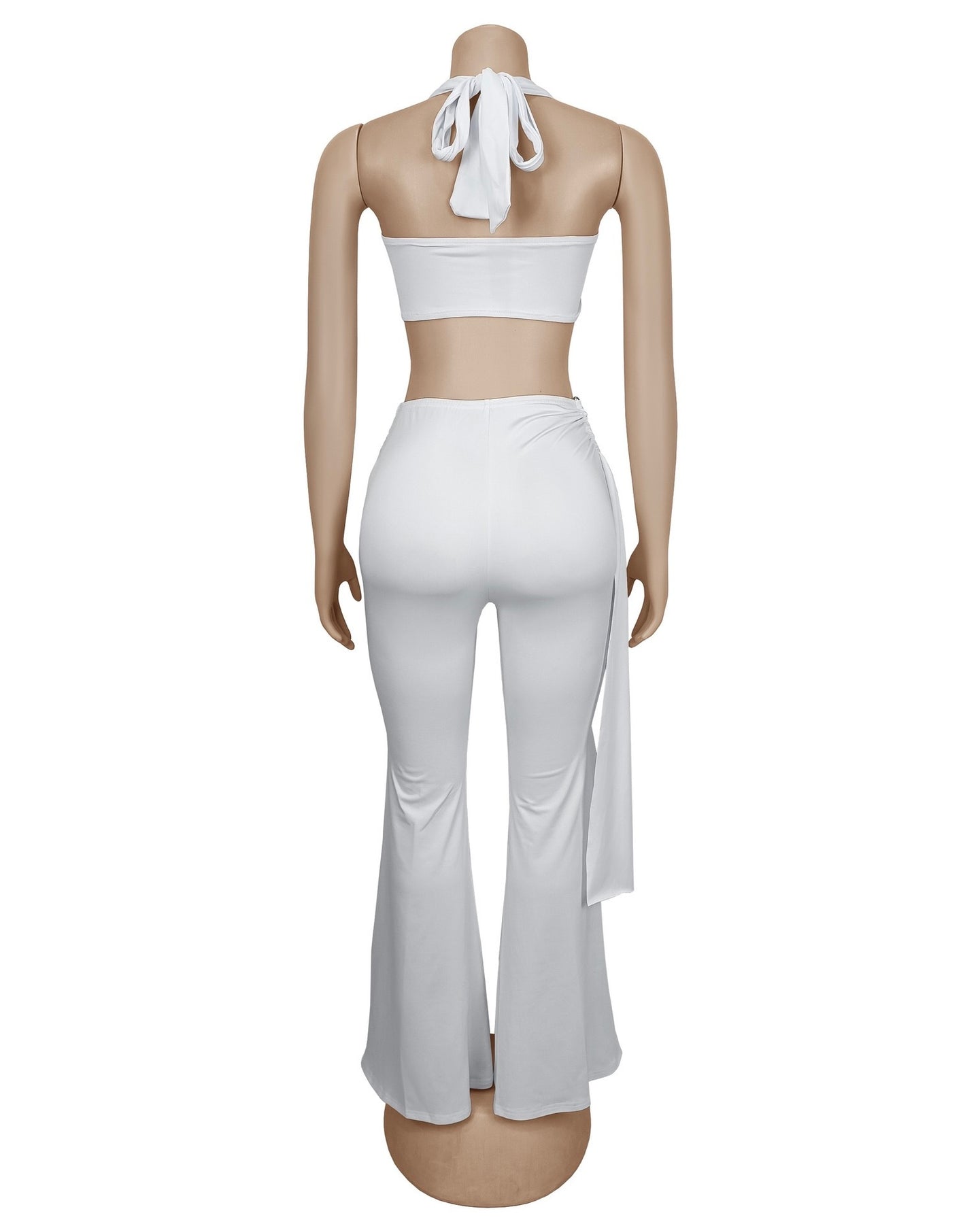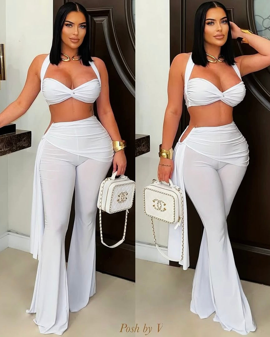 The Joelle Two-Piece Set defines modern glam — bold, confident, and effortlessly sexy. Featuring a twist-front crop top with halter ties and matching high-waist sheer flared pants, this look was made to turn heads at every occasion.