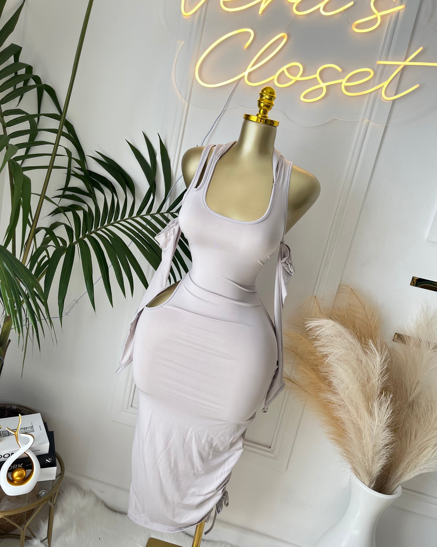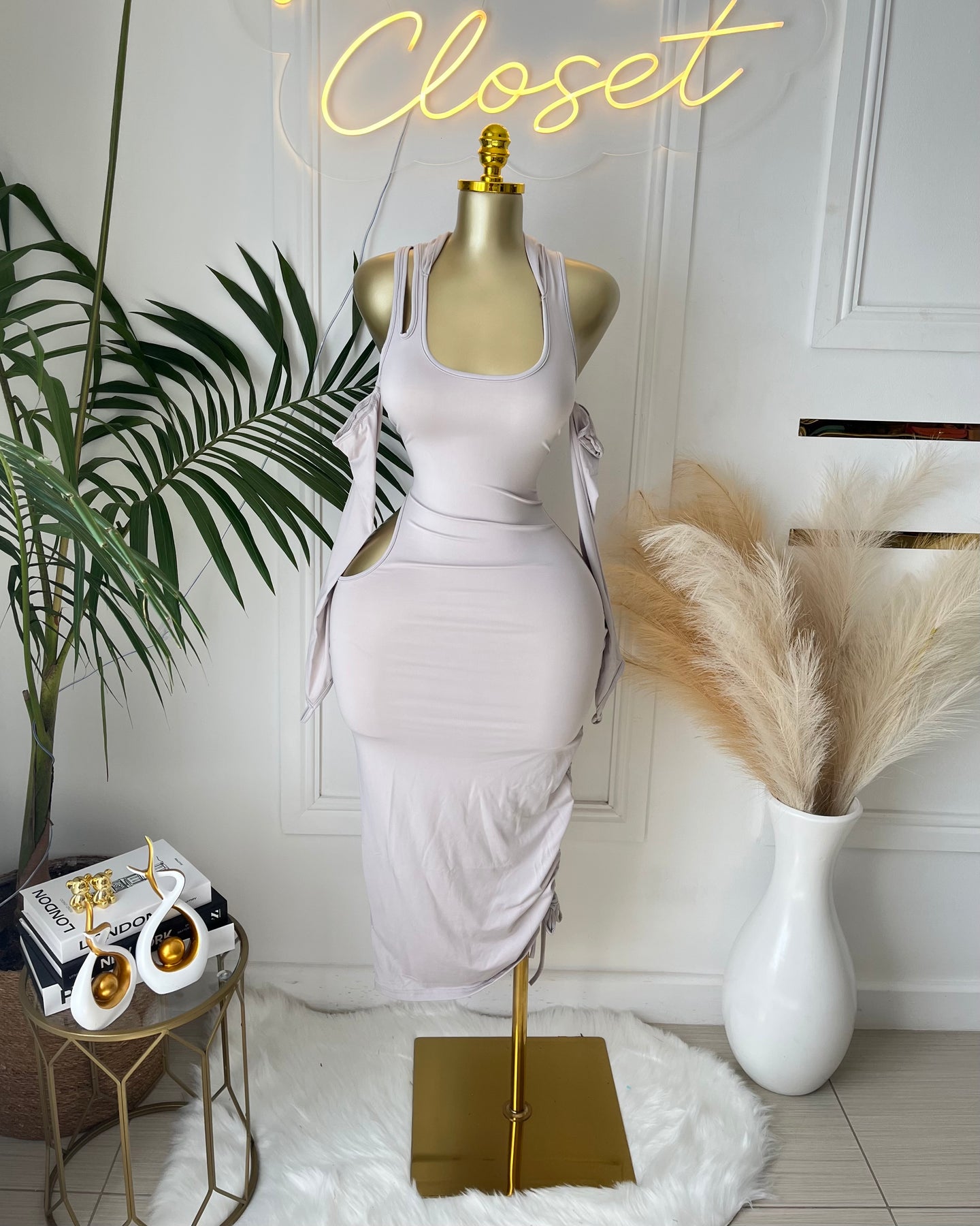 The Aziza Ruched Midi Dress combines elegance and style with its sleek design and ruched detailing. Featuring cold-shoulder sleeves and medium stretch, this dress is perfect for any occasion.