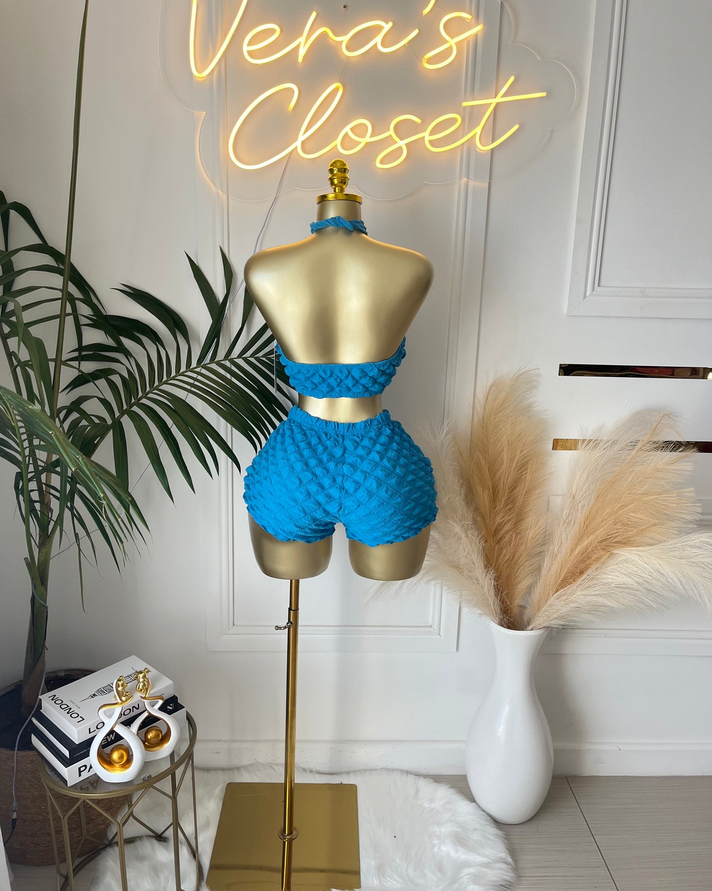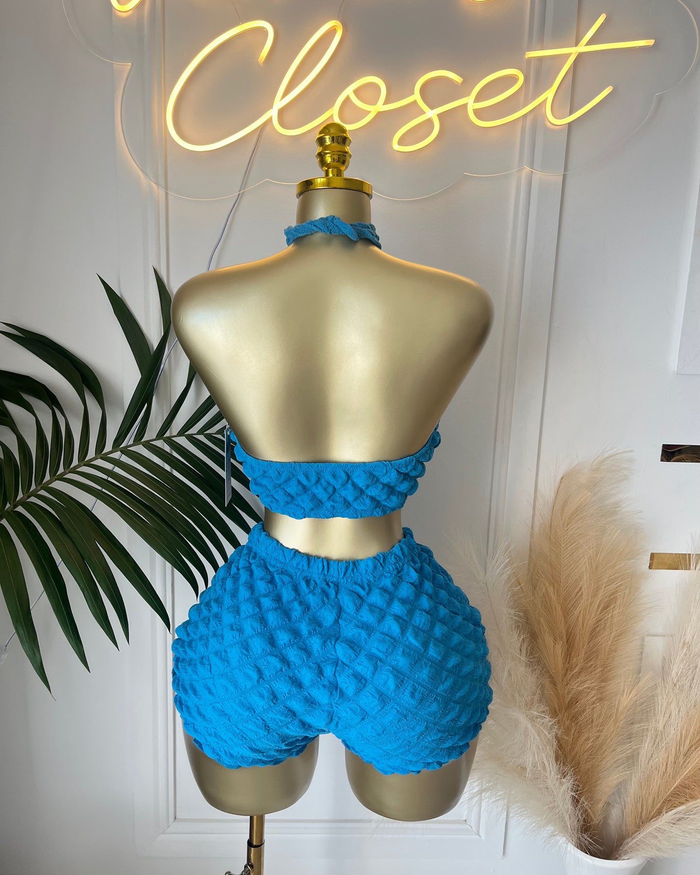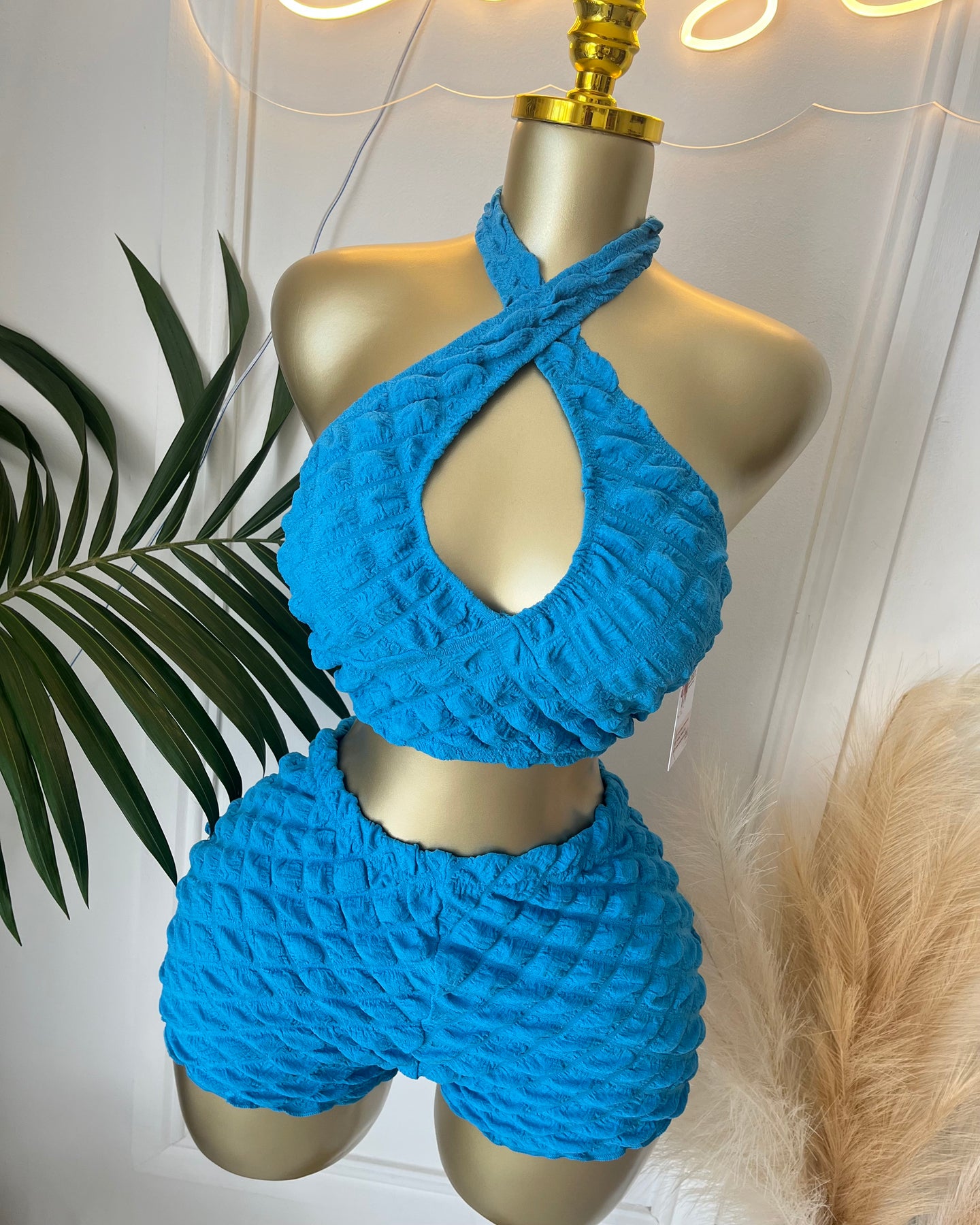 Stay stylish and comfortable with the Upgrade Textured Short Set. This co-ord set features a trendy halter crop top and high-waisted shorts with a unique textured fabric, perfect for a chic casual look.
