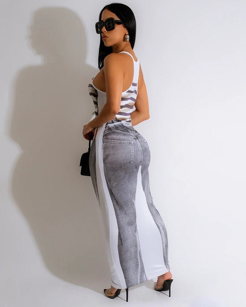 - Clothing Feature: Denim print, bodycon fit, contrast side panels