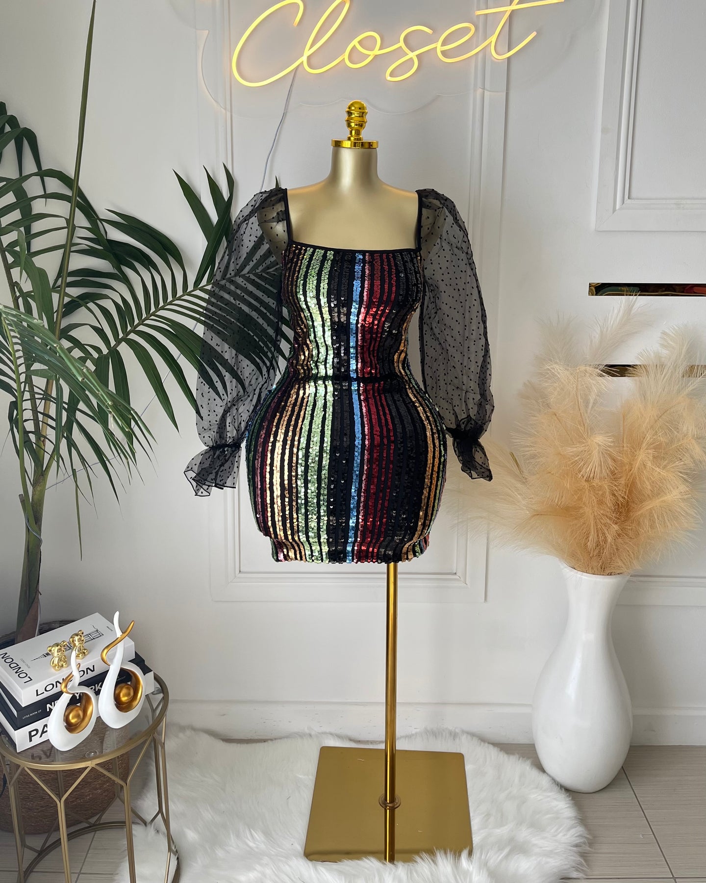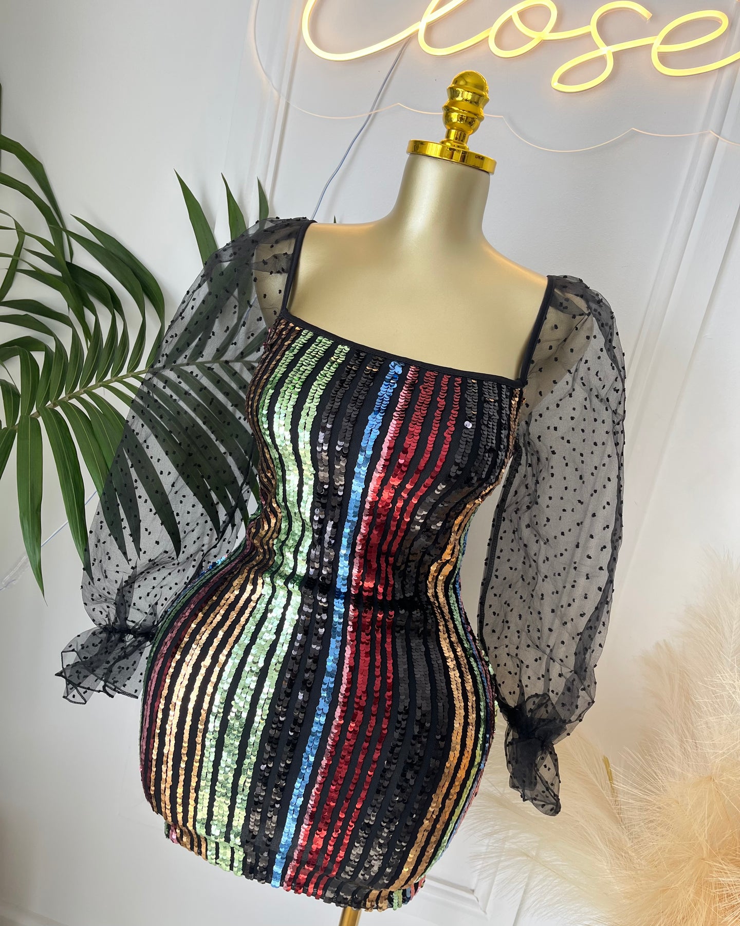 Sparkle and shine in the Mia Mini Dress—a dazzling multi-colored sequin mini dress with sheer long sleeves. Perfect for festive parties or nights out, this medium-stretch dress combines comfort with glamour, ensuring you're the center of attention wherever you go.