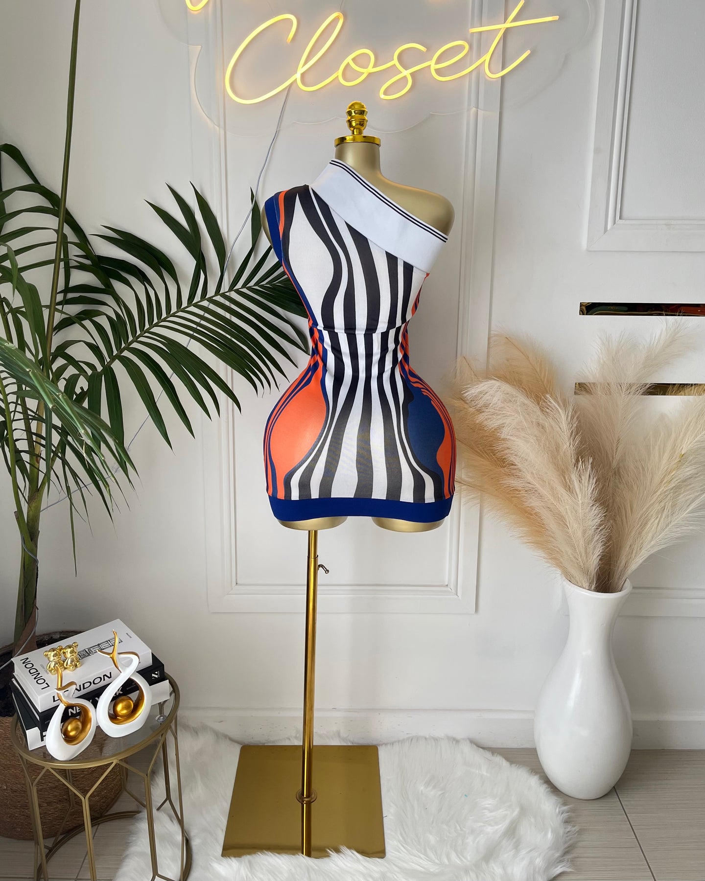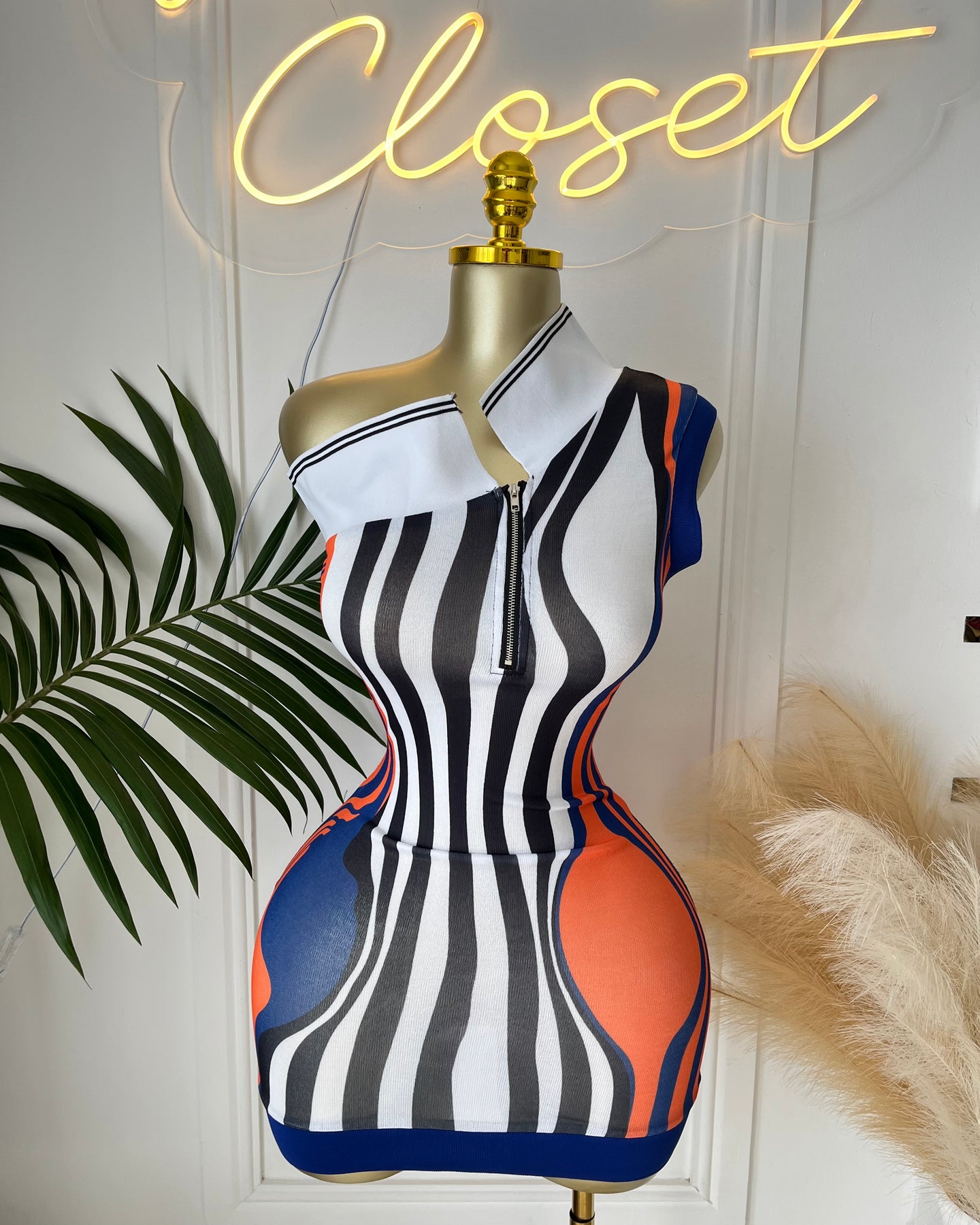 Step out in style with the Roselle Mini Dress—a chic, curve-hugging mini dress featuring a bold, geometric stripe design in vibrant shades of blue and orange. Perfect for adding a pop of color to your party wardrobe, this dress is designed with medium stretch for a flattering fit.