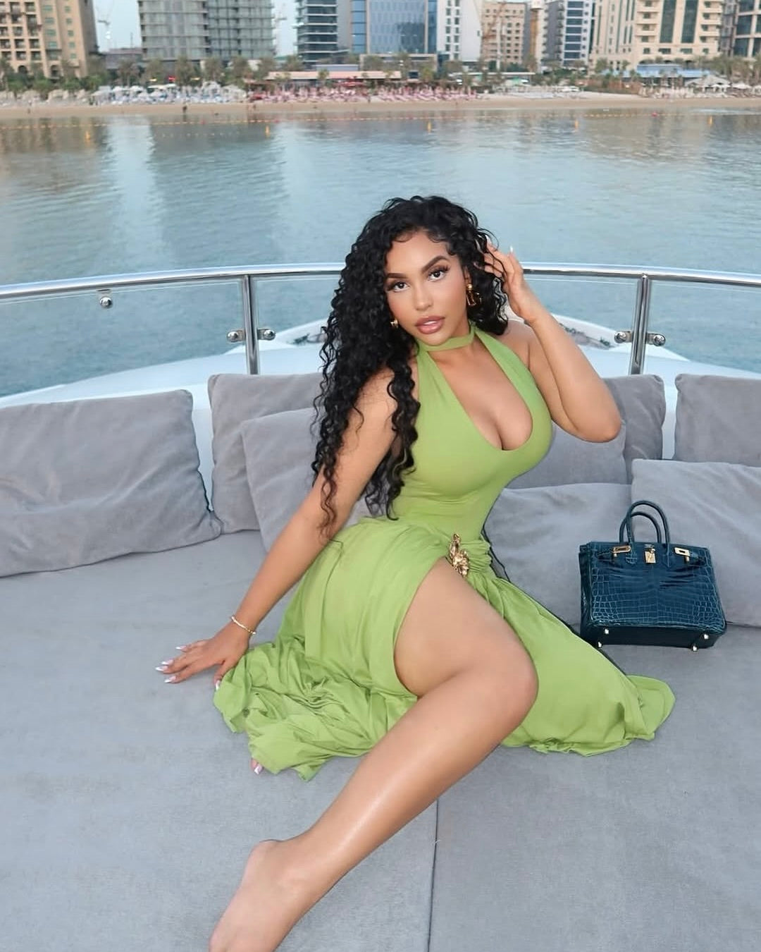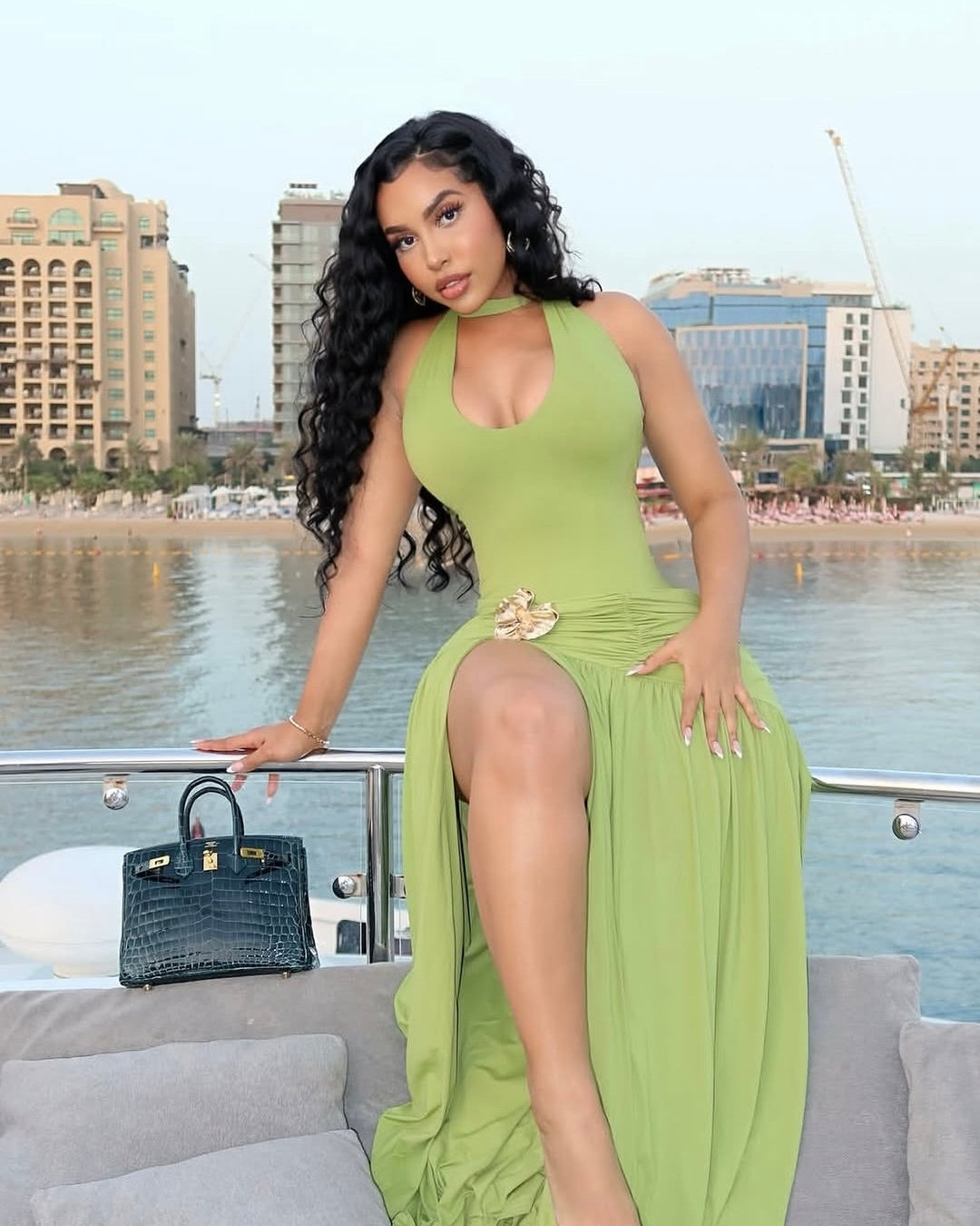 The Jayden Lime Halter Skirt Set Dress is bold, glamorous, and made for luxury moments. Featuring a flattering halter neckline, waist cut detail with gold accent, and a flowing high-slit silhouette, this dress is perfect for vacations, yacht parties, birthdays, and sunset dinners.