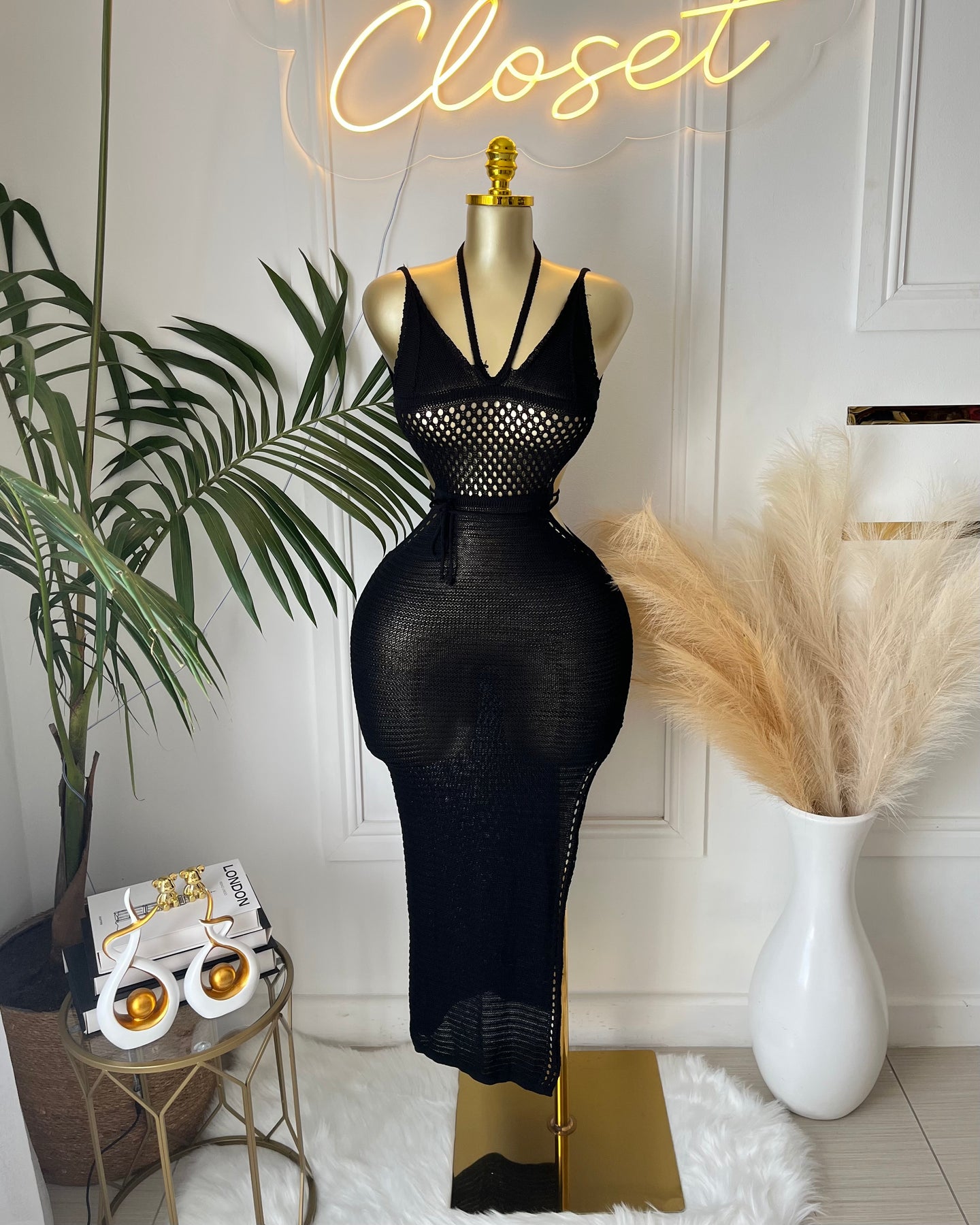 Turn heads at your next outing with the Nice Picnic Dress—a sultry black mesh maxi dress with adjustable side ties and a flattering slit. Designed with medium-stretch fabric for a comfortable and stylish fit, it's perfect for beach days, poolside events, or casual summer picnics.