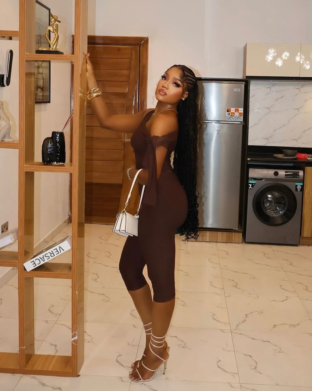 - Clothing Features: Tie-shoulder detail, asymmetrical top, bodycon pants, vibrant color