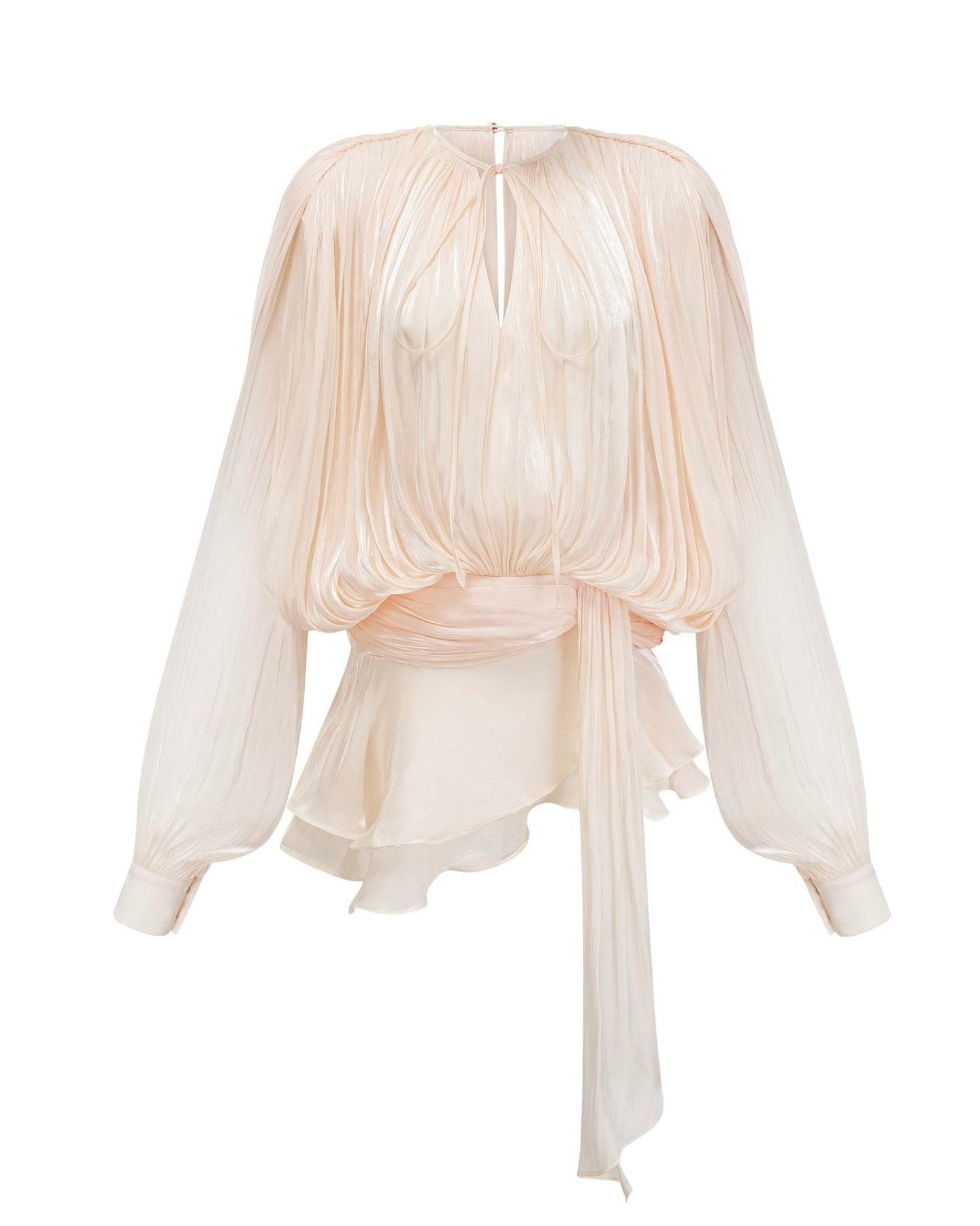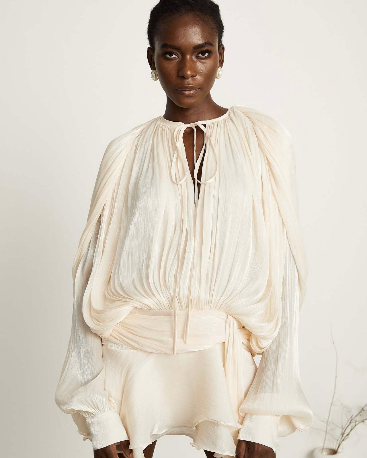 • Clothing Features: Satin finish, flowy sleeves, ruffle hem, waist tie