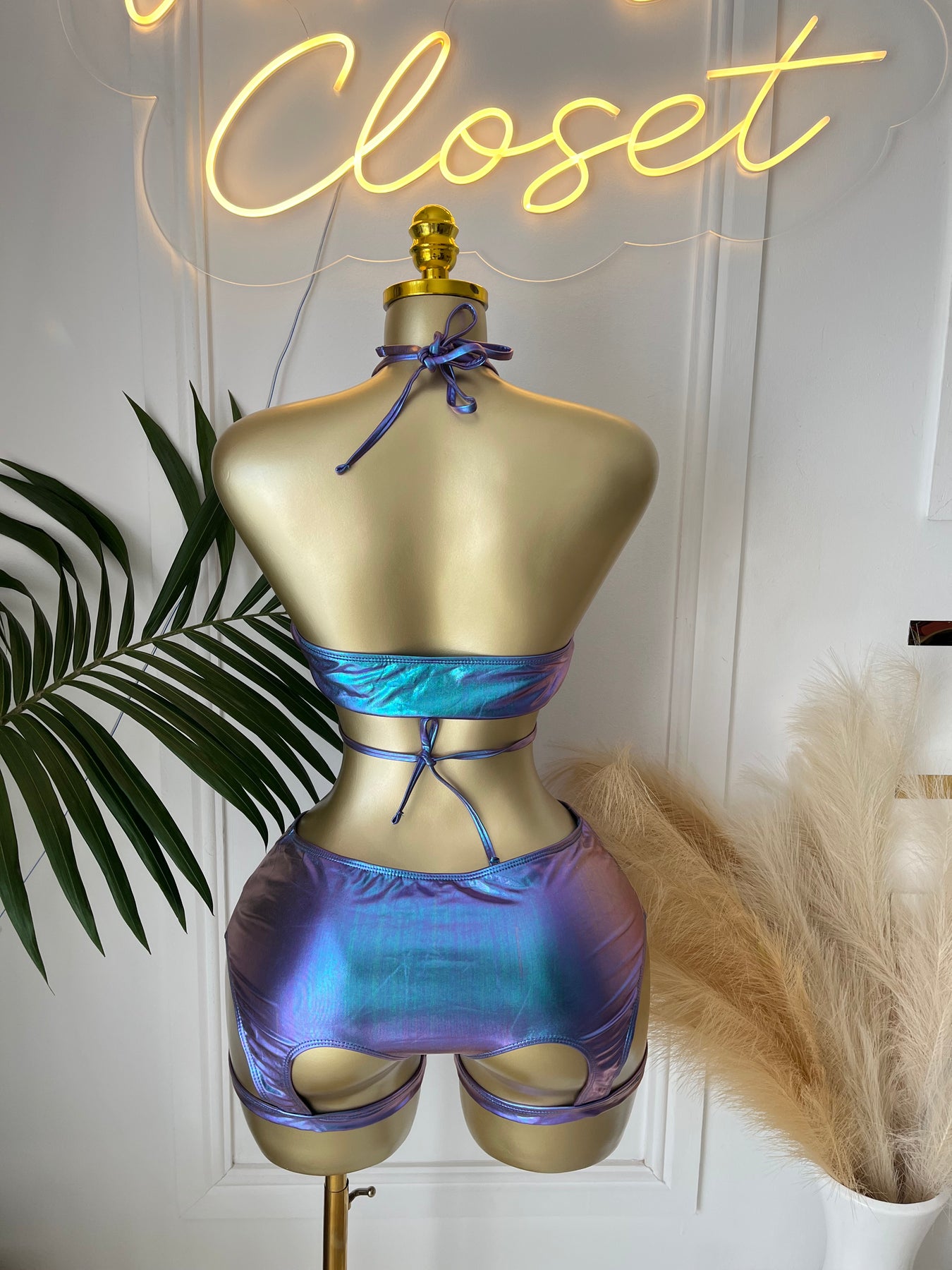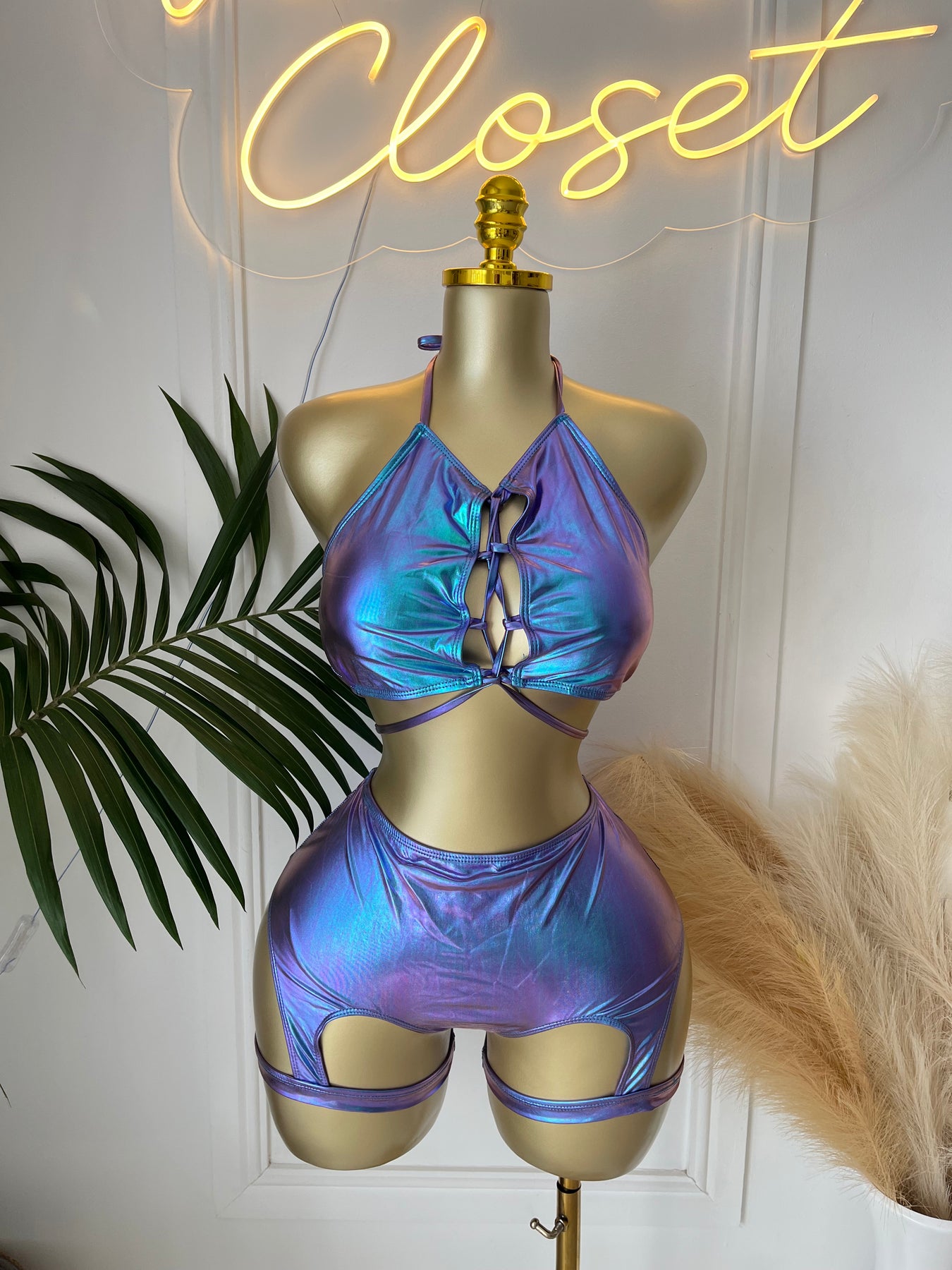 • Style: Two-piece metallic set with lace-up top and high-waisted bottoms