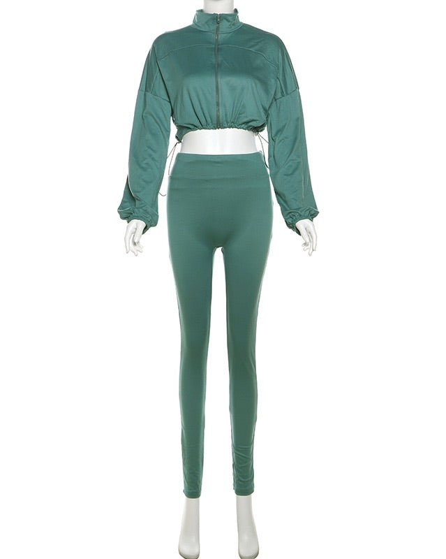 • Clothing Feature: Elastic waistband, zip crop top, matching solid tones