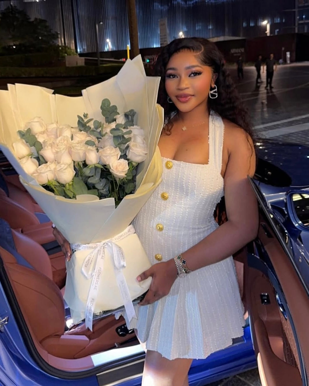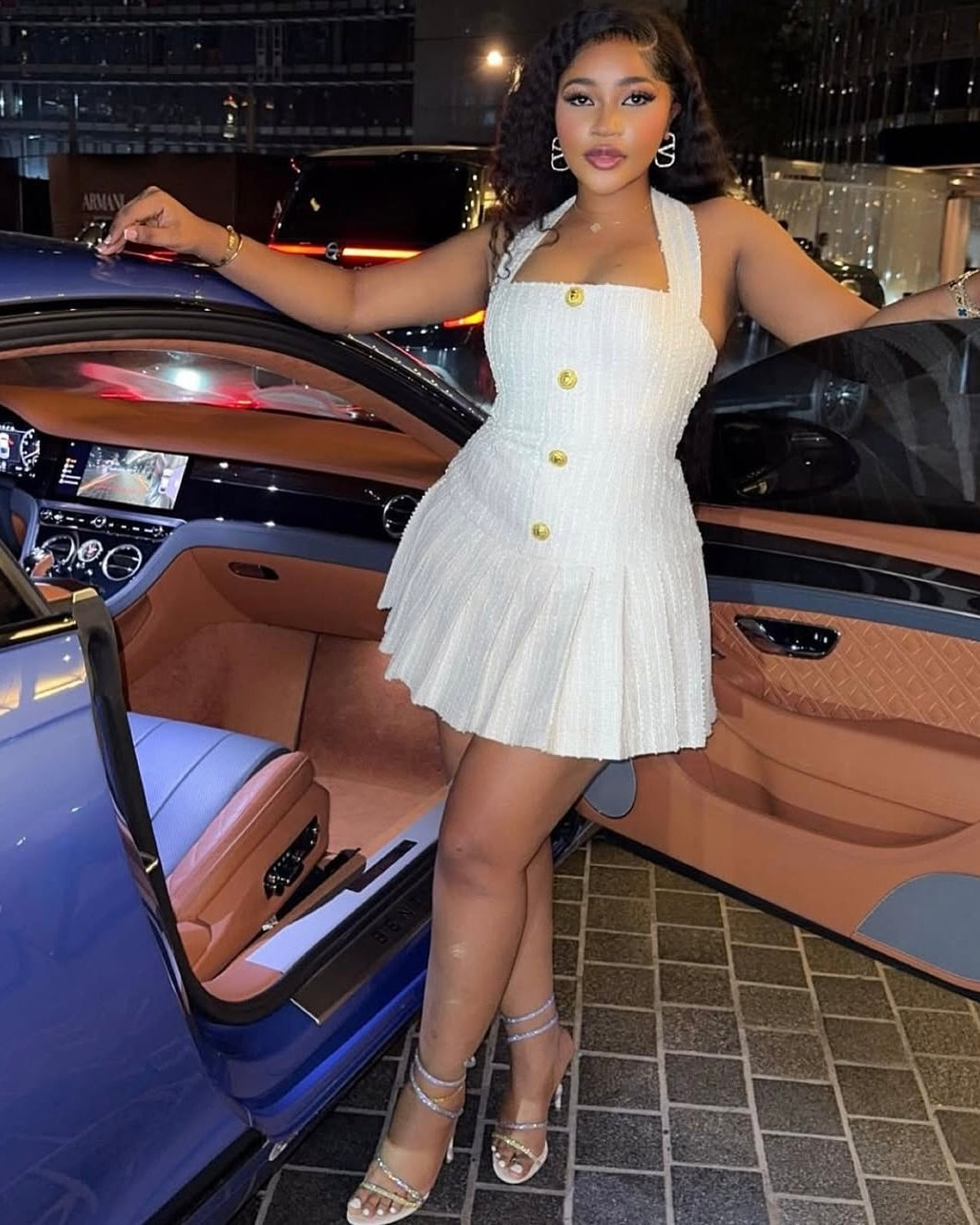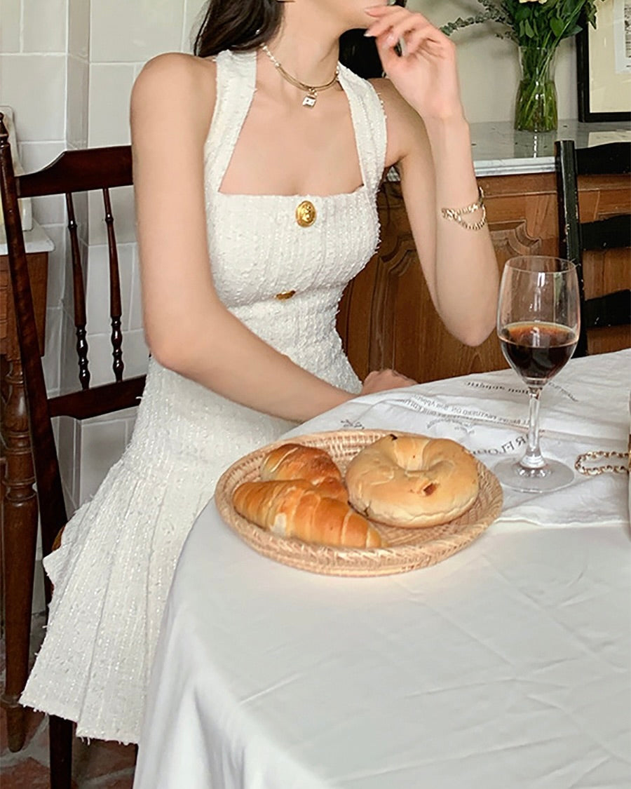 The Cece Gold Button Mini Dress is giving rich, classy, and effortlessly feminine. Designed with a flattering halter neckline, structured bodice, and pleated mini skirt, this piece hugs your waist while giving a soft flirty flow. The gold button details add that luxe touch—perfect for nights out, birthday dinners, or soft life moments.