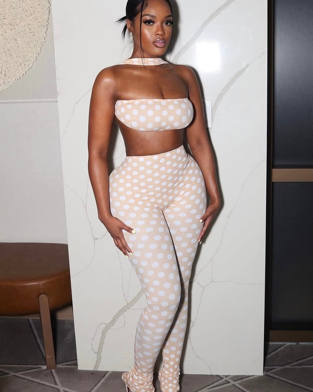The soft neutral tone paired with playful polka dots gives you that classy yet eye-catching look, perfect for brunch dates, vacations, or a stylish girls’ day out. It’s giving soft life, but make it statement.