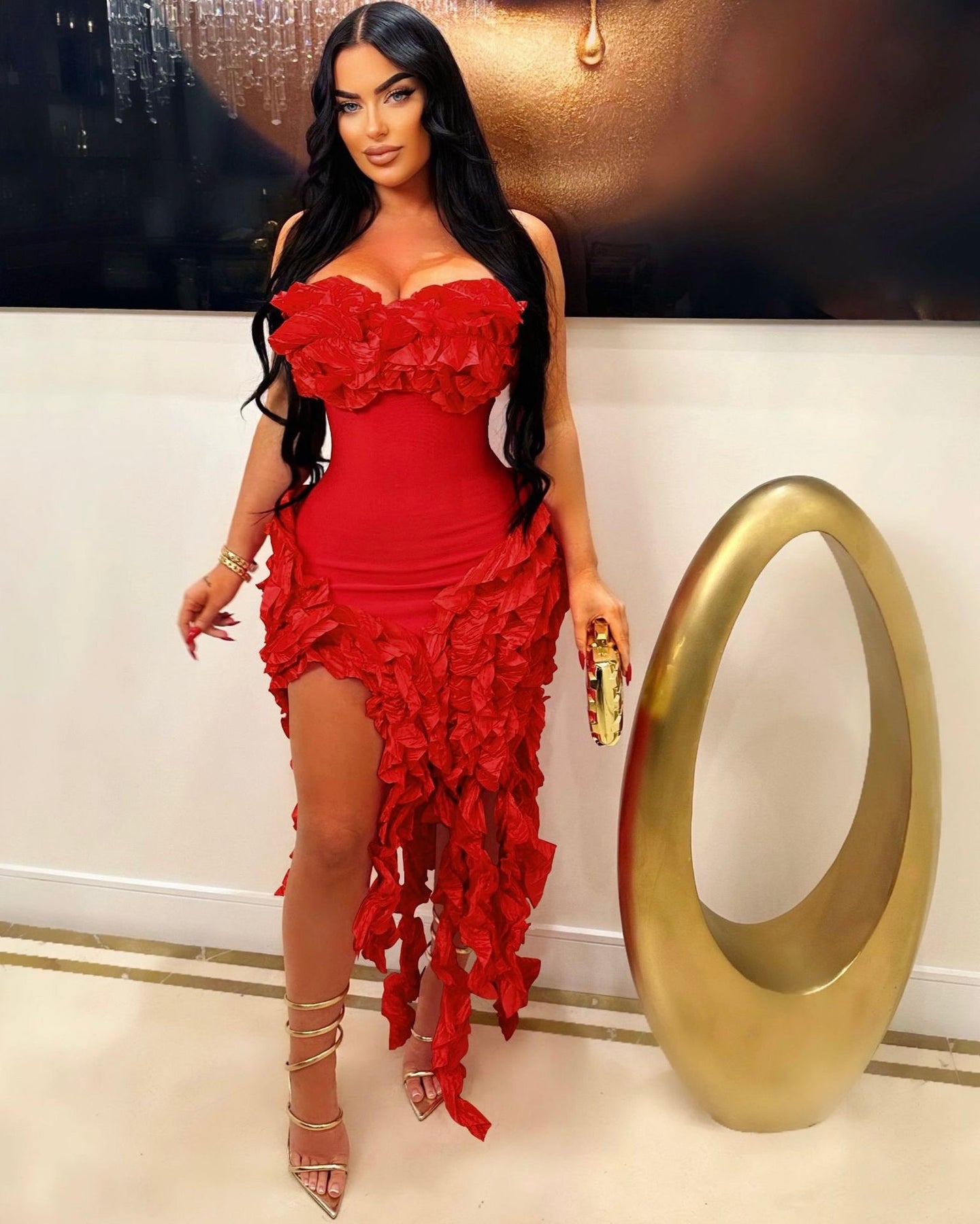 All eyes on you. The Nellie Ruffle Strapless Statement Dress is made for unforgettable entrances. Featuring a bold strapless design with dramatic ruffle detailing and a high-low silhouette, this dress hugs your body while adding volume and movement in all the right places.