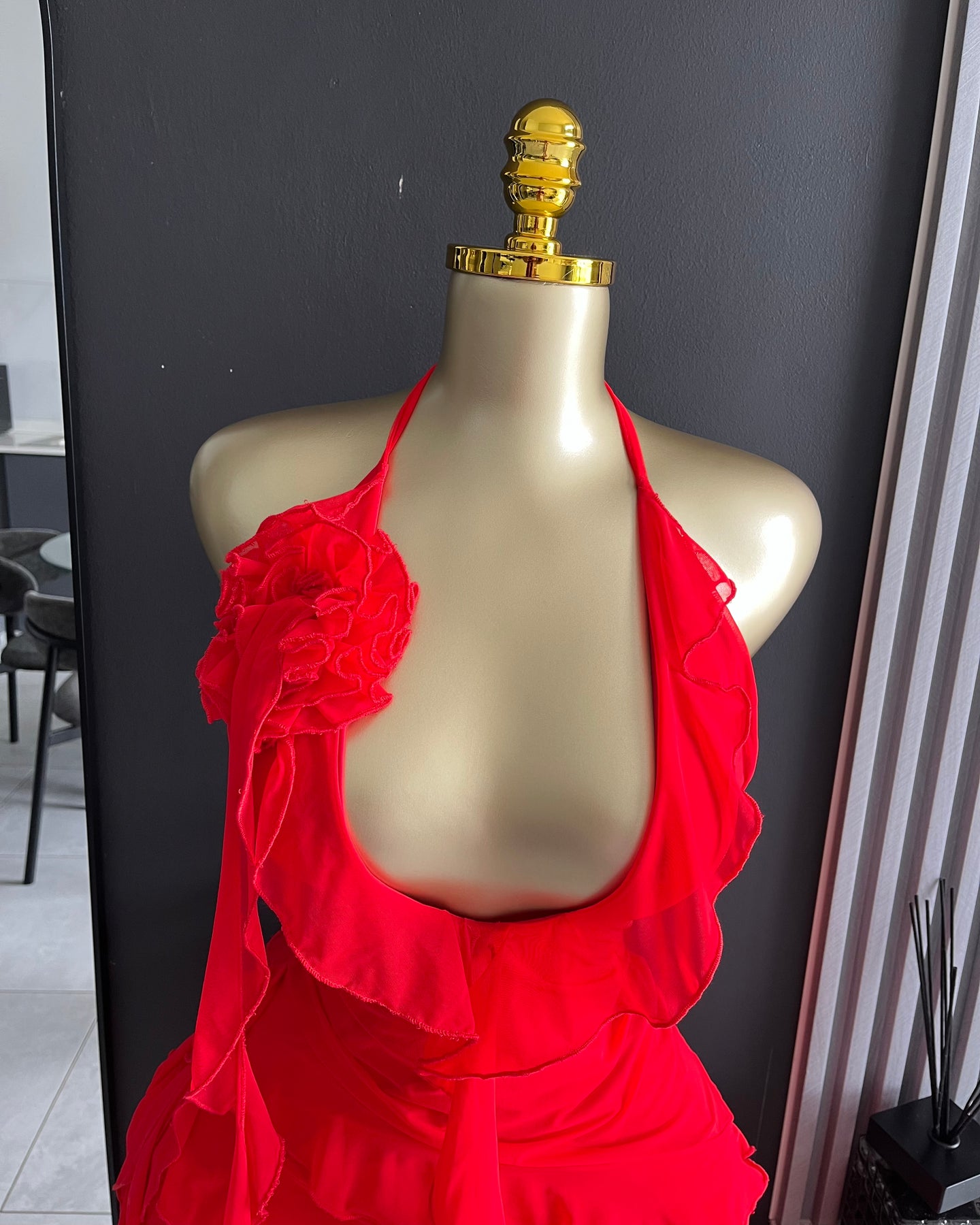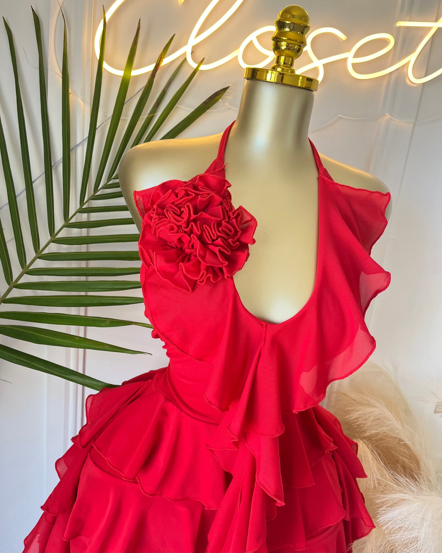 • Clothing Feature: Halter neck, 3D flower applique, cascading ruffles, layered hem