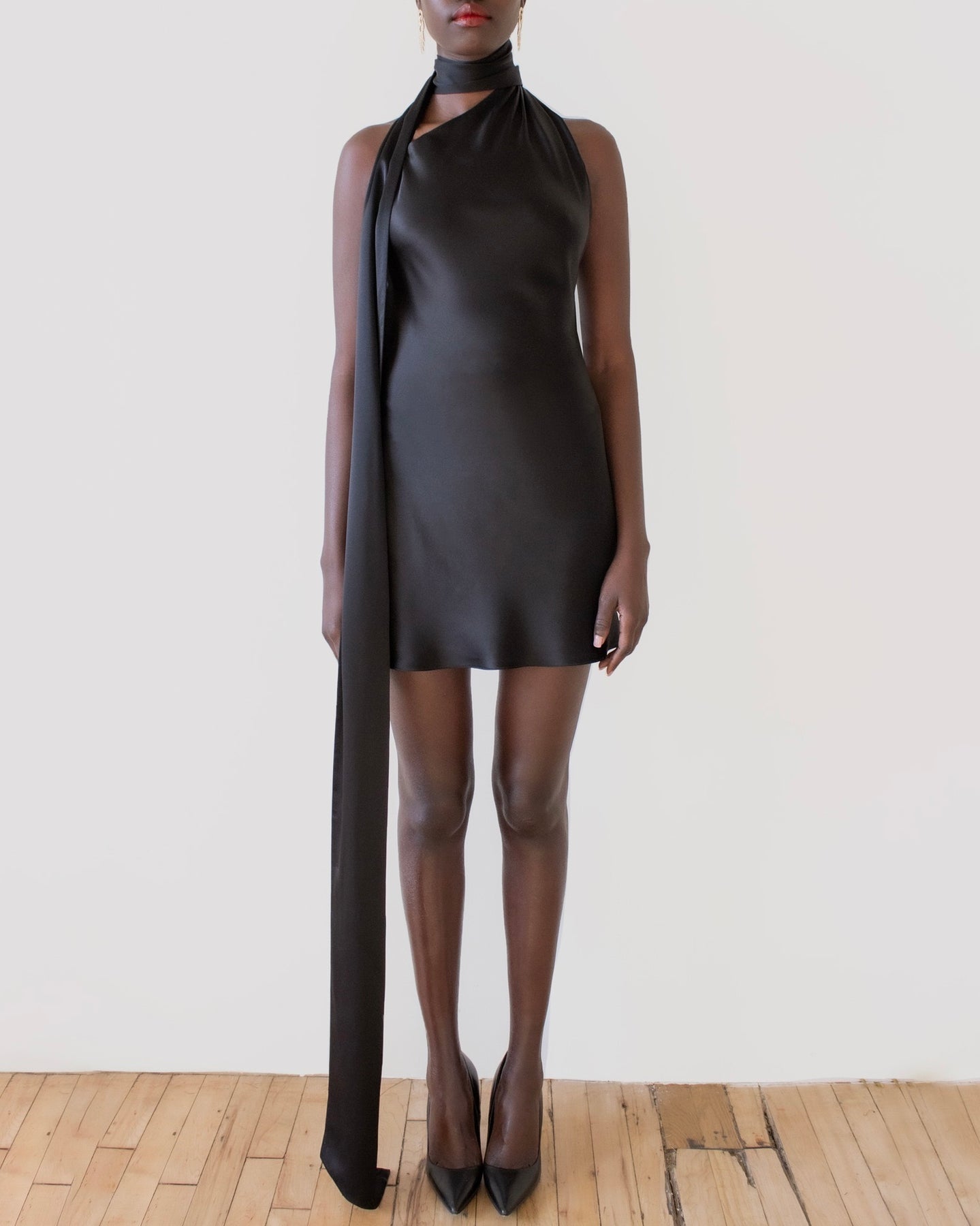 The Belmont Satin Scarf-Neck Mini Dress is sleek, minimal, and impossibly chic — featuring a fluid satin finish, scarf neckline, and a clean silhouette perfect for luxe evenings.