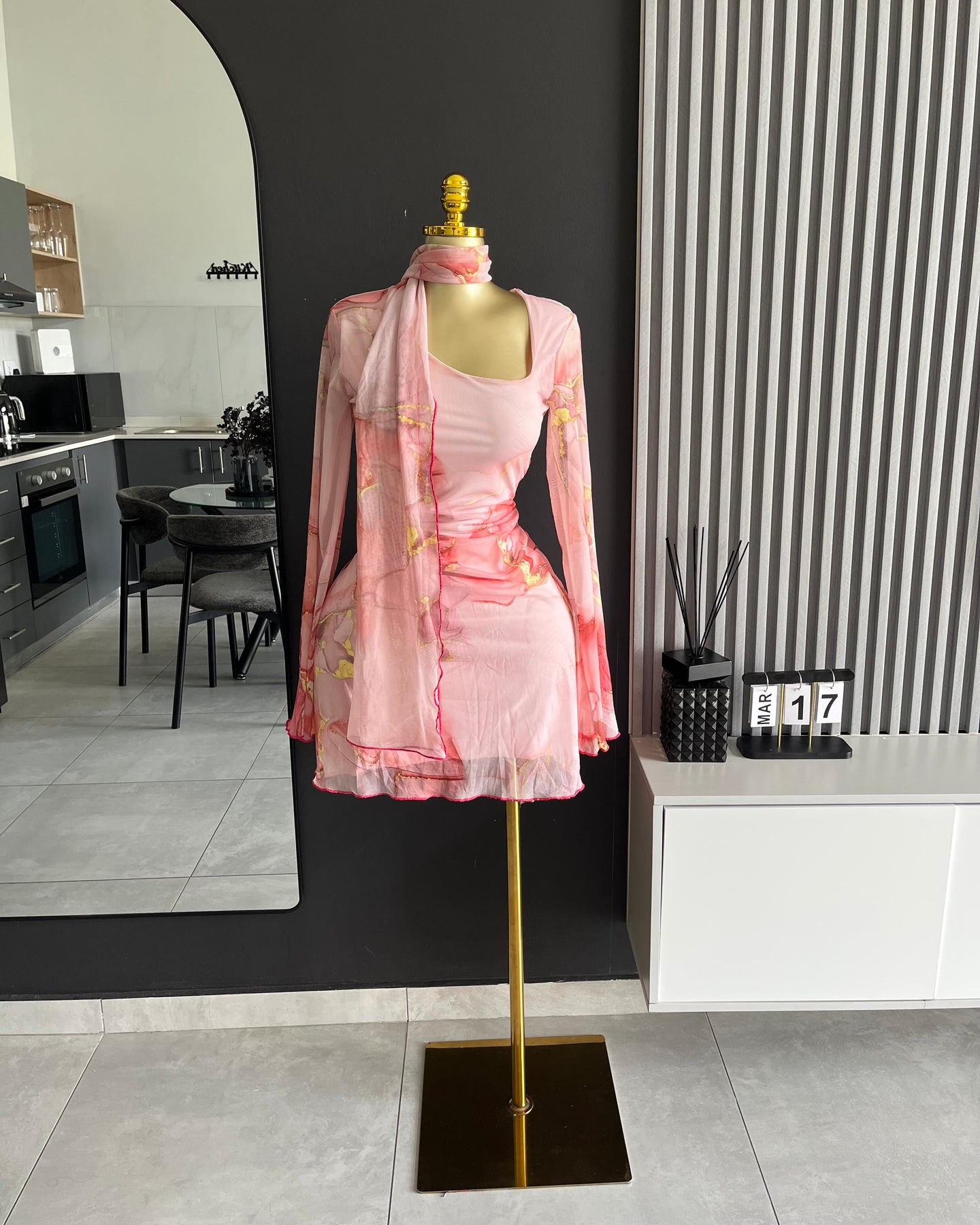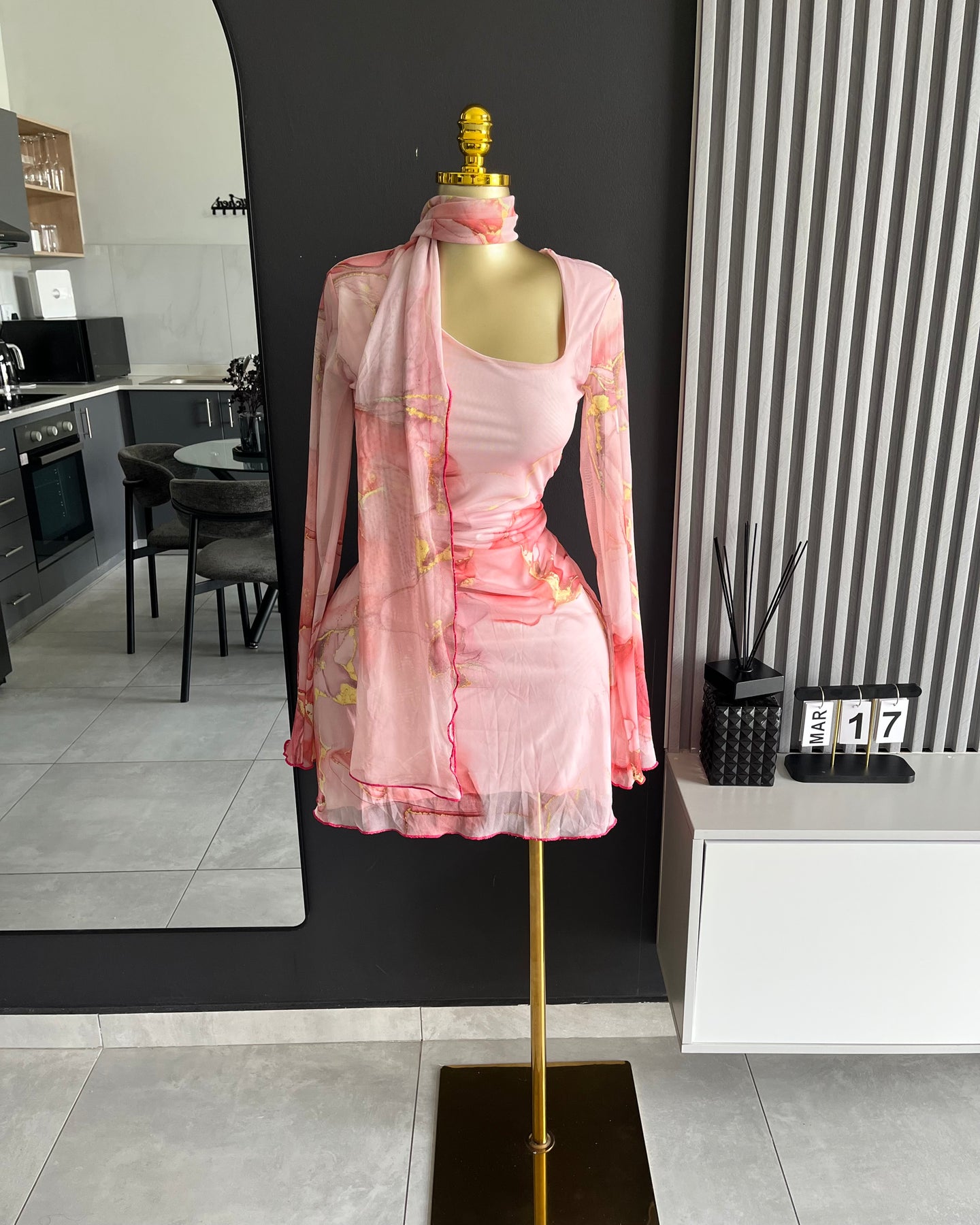 Clothing Feature(s): Mesh overlay, marble print, sheer sleeves, styling scarf