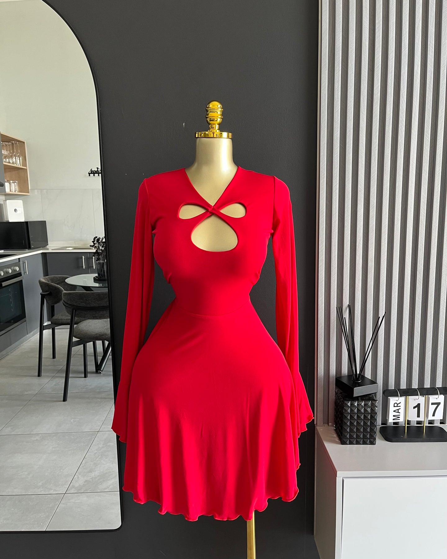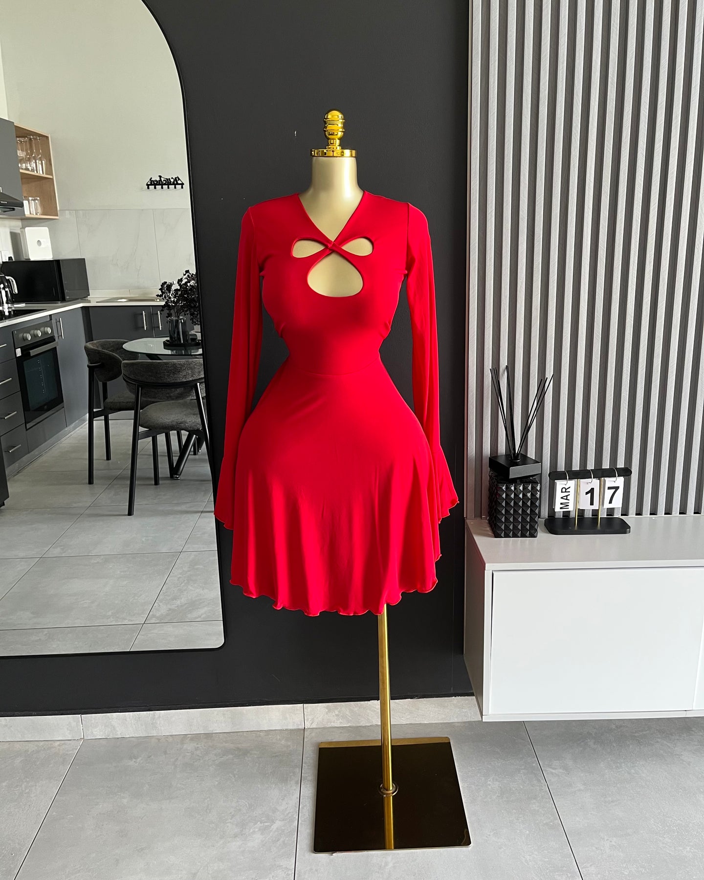 Clothing Feature(s): Cut-out detail, skater silhouette, flared hem, long sleeves