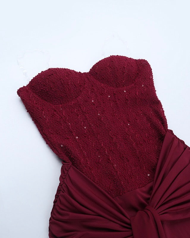 • Clothing Features: Structured corset bodice, draped waist panel, sweetheart neckline, fitted maxi skirt